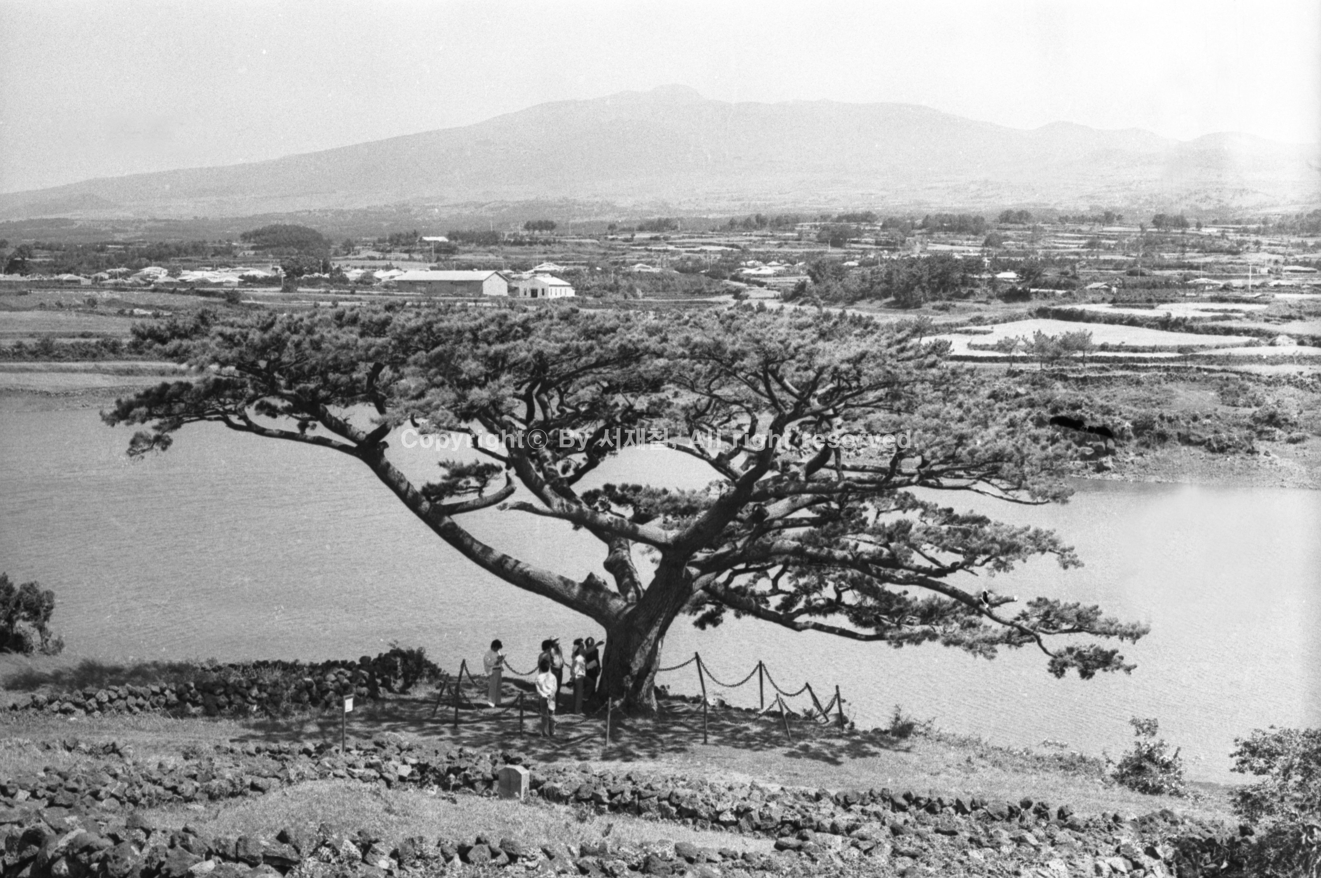 애월읍 수산저수지에 있는 보호수 소나무이다. 보호수 밑에서 나무를 관찰하는 사람들의 모습이 보이고, 뒤로는 한라산 전경이다.