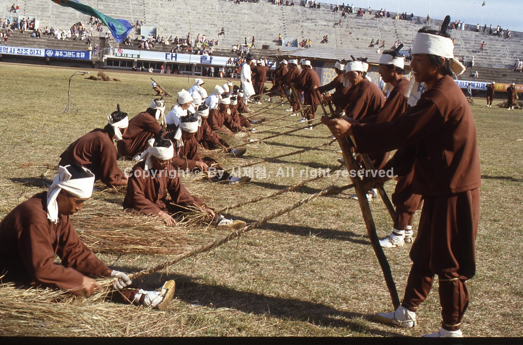 초가지붕을 잇기 위해 줄을 놓고 있다. 앞선 사람은 ‘집줄’을 만들기 위해 두 줄을 어울리고 있다.