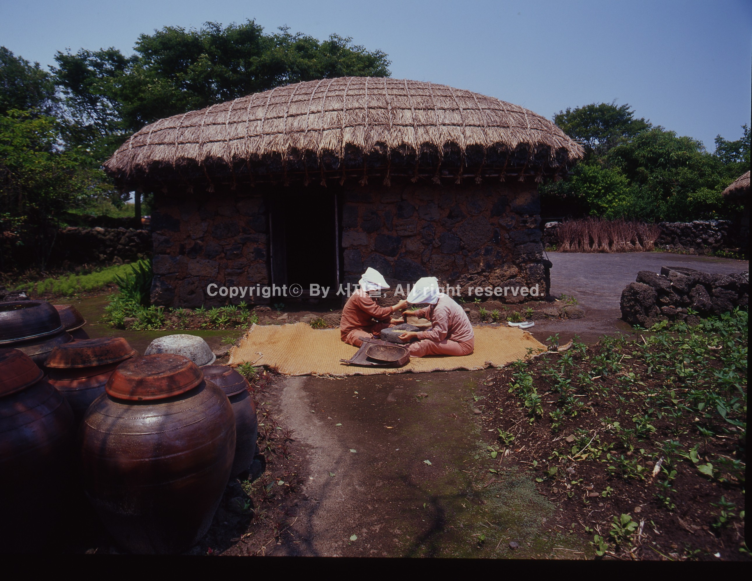 시골 마을 초집 앞에서 갈옷 입은 여자들이 멍석 위에서 맷돌로 곡식을 갈고 있다. 뒤로는 콩 대를 말리고 있다. 민속촌에서 시연하고 있다.