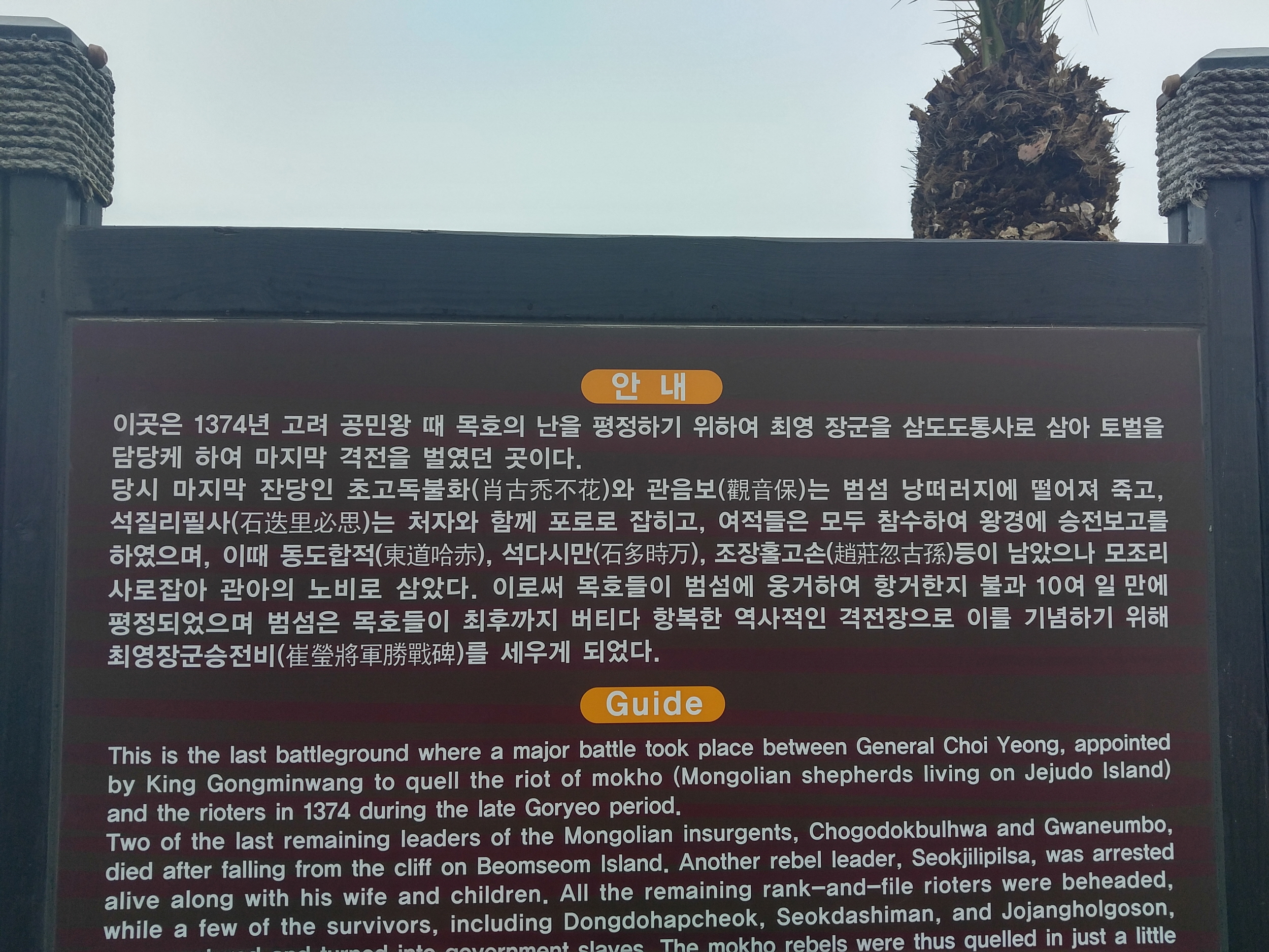 목호의 괴수, '관음보'와 '초고독불화'는 남쪽벼랑으로 투신자살시키고, '석질리필사'는 처자를 거느리고 투항해왔다. 잔적을 모두 잡아서 관아의 노비로 삼았다. 유적지로는 범섬, 명월포구, 법환포구, 막숙, 군자왓, 오다리, 배염줄이가 있다.