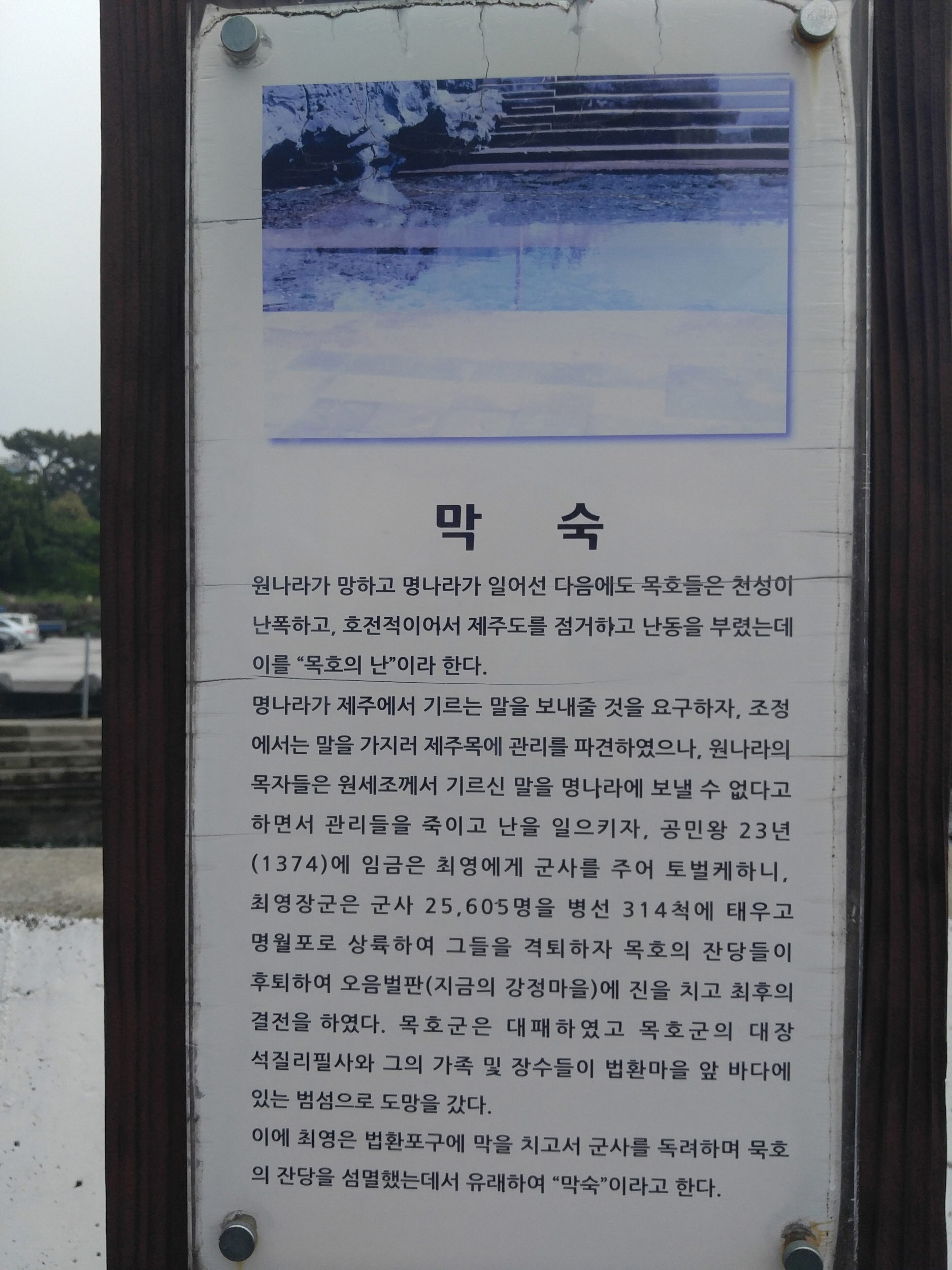 고려 공민왕 때(1874)  탐라에 목호의 난이 일어나자 최영 장군으로 하여금  정벌하도록 하였는데 현재 서귀포시 법환동 법섬이 바라보이는 곳에 진을 쳤다.