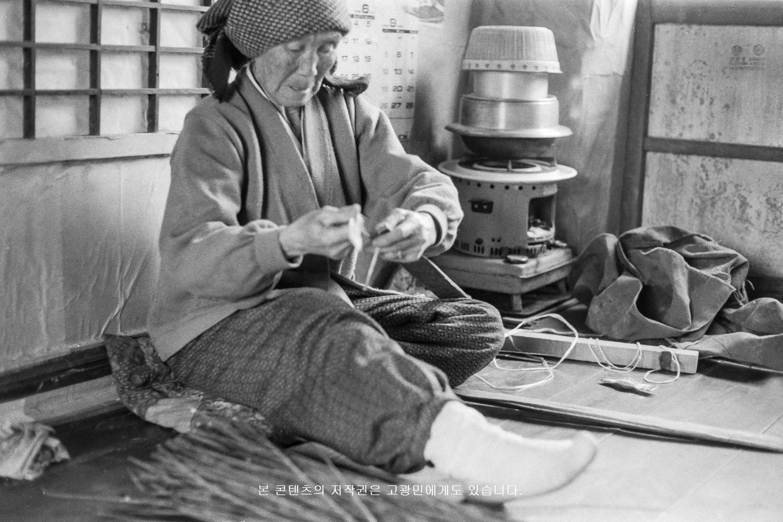 *개요 : ‘징대’에 걸어 묶을 ‘징ᄂᆞᆯ’을 가다듬고 있다. ‘징대’는 ‘푸는체’ 바닥을 짜는데 쓰이는 나무 자[尺] 모양의 연장이다. 양쪽 끝 가운데가 볼록하게 튀어나왔다. 여기에 ‘징ᄂᆞᆯ’을 건다. 이를 “‘징대’에 ‘징ᄂᆞᆯ’ 건다”고 한다.
