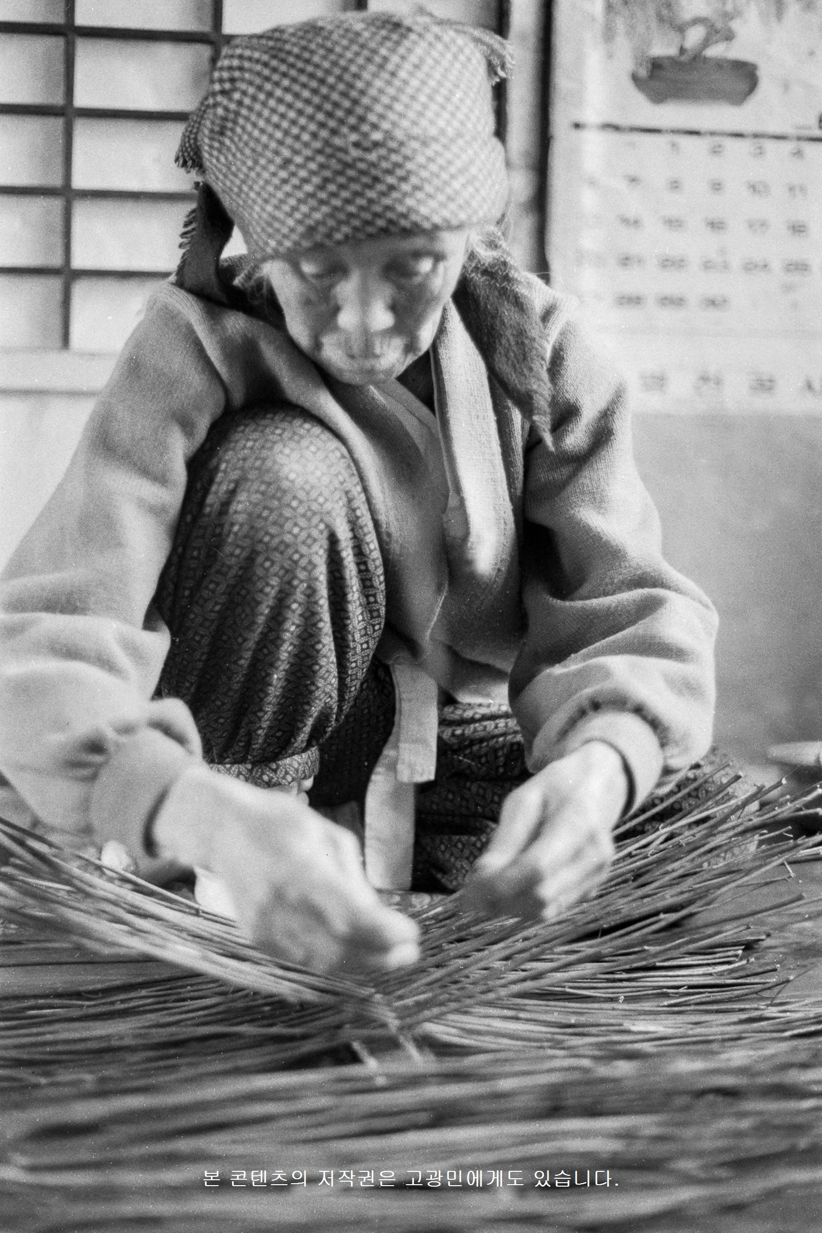 *개요 : ‘푸는체’ 바닥 재료인 두 개의 ‘살’이 하나의 조를 이루고 좌우 번갈아가며 ‘징ᄂᆞᆯ’에 끼워나가고 있다. ‘살’이 서로 포개지지 않게 굵기가 일정한 것들끼리 상하로 굵고 가는 것을 서로 맞붙여가며 차차 굵은 것부터 끼워나간다.