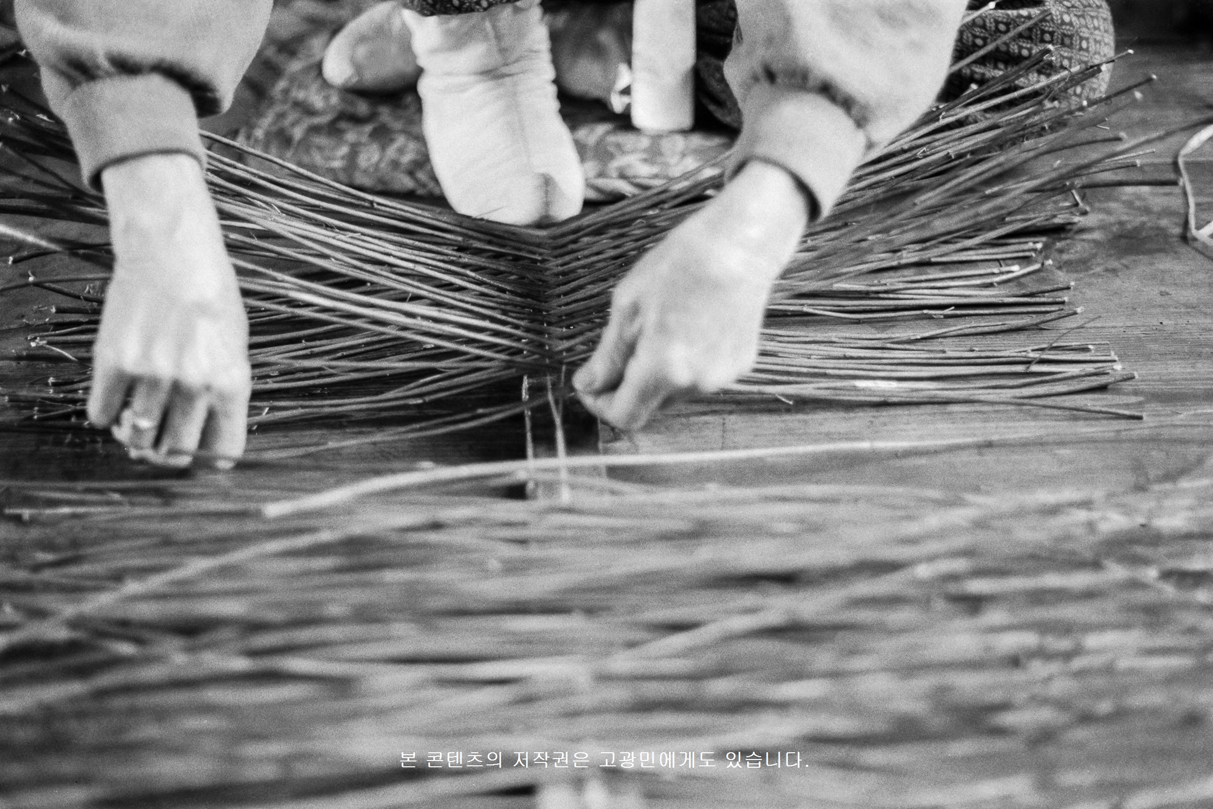 *개요 : ‘푸는체’ 바닥 재료인 두 개의 ‘살’이 하나의 조를 이루고 좌우 번갈아가며 ‘징ᄂᆞᆯ’에 끼워나가고 있다. ‘살’이 서로 포개지지 않게 굵기가 일정한 것들끼리 상하로 굵고 가는 것을 서로 맞붙여가며 차차 굵은 것부터 끼워나간다.