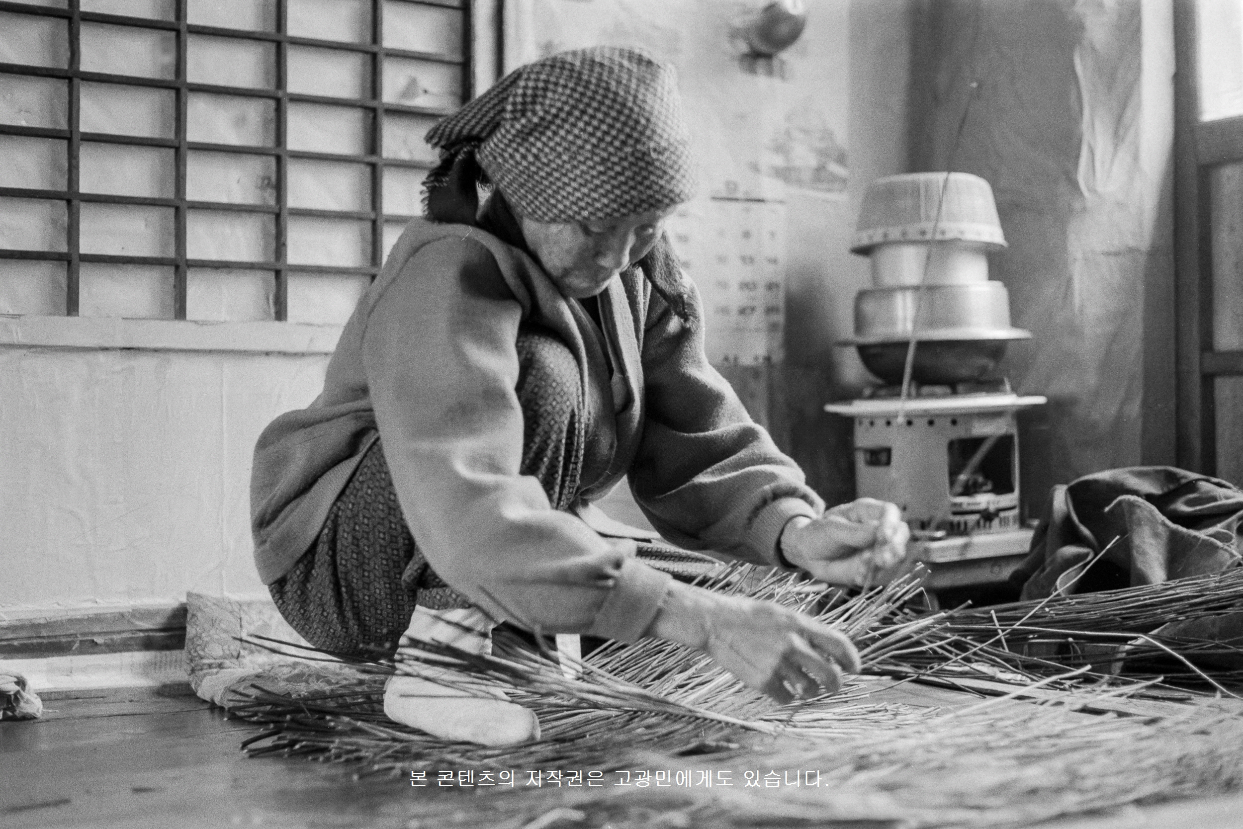 *개요 : ‘푸는체’ 바닥 재료인 두 개의 ‘살’이 하나의 조를 이루고 좌우 번갈아가며 ‘징ᄂᆞᆯ’에 끼워나가고 있다. ‘살’이 서로 포개지지 않게 굵기가 일정한 것들끼리 상하로 굵고 가는 것을 서로 맞붙여가며 차차 굵은 것부터 끼워나간다.