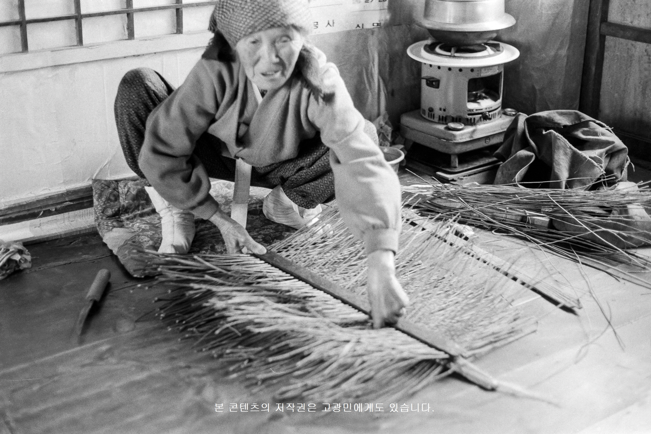 *개요 : ‘징ᄂᆞᆯ’에 ‘살’을 끼워놓고 나서 ‘징ᄂᆞᆯ’로 결어나가고 있다. 이를 ‘징 꾀기’라고 한다. ‘징 꾀기’를 위해서는 ‘징대’를 몸의 방향과 나란히 놓고 징을 꾀어나가야 한다. ‘징꾀기’를 할 준비를 서두르고 있다. ‘징대’는 ‘푸는체’ 바닥을 짜는데 쓰이는 나무 자[尺] 모양의 연장이다. 양쪽 끝 가운데가 볼록하게 튀어나왔다.