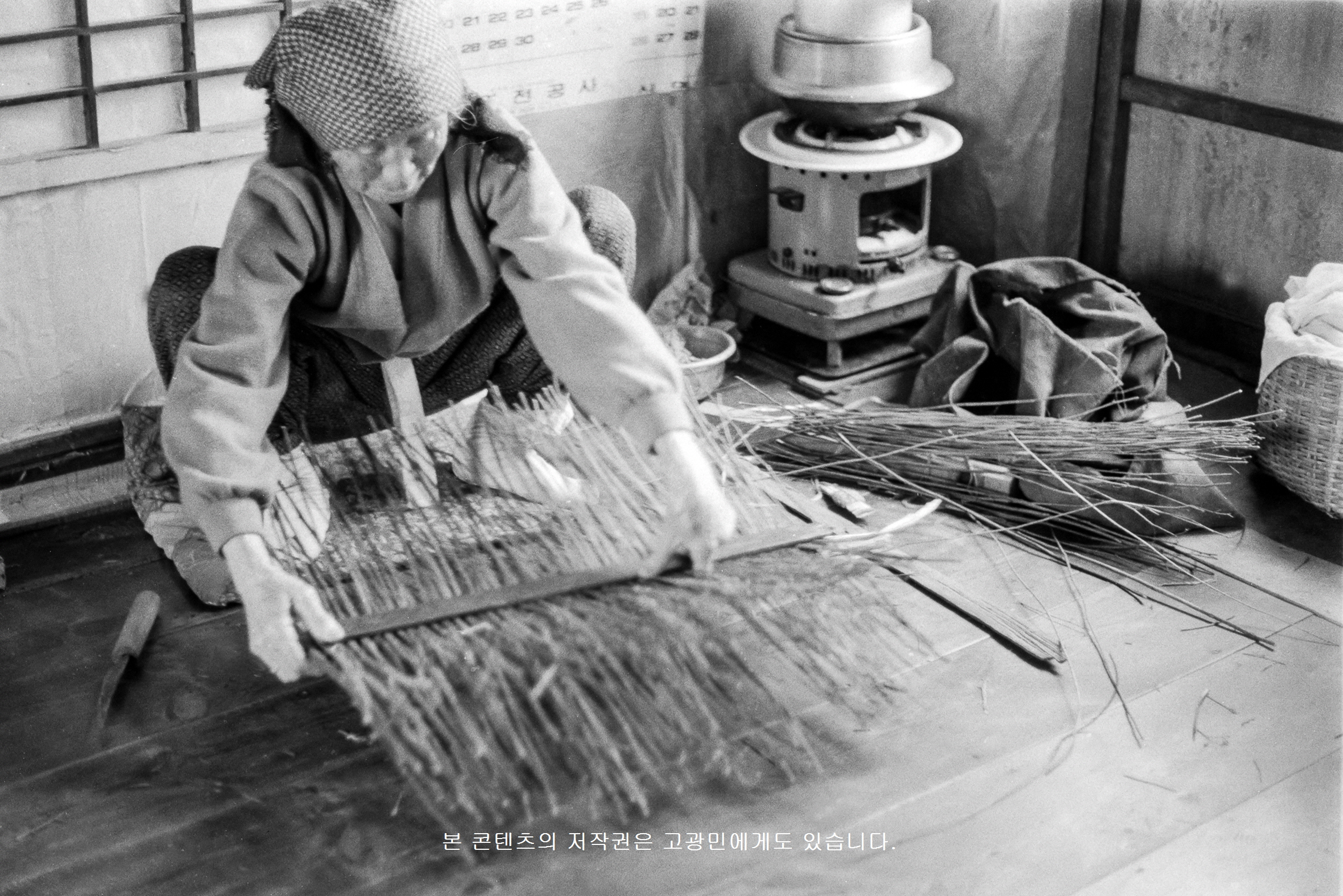 *개요 : ‘징ᄂᆞᆯ’에 ‘살’을 끼워놓고 나서 ‘징ᄂᆞᆯ’로 결어나가고 있다. 이를 ‘징 꾀기’라고 한다. ‘징 꾀기’를 위해서는 ‘징대’를 몸의 방향과 나란히 놓고 징을 꾀어나가야 한다. ‘징대’는 ‘푸는체’ 바닥을 짜는데 쓰이는 나무 자[尺] 모양의 연장이다. 양쪽 끝 가운데가 볼록하게 튀어나왔다.