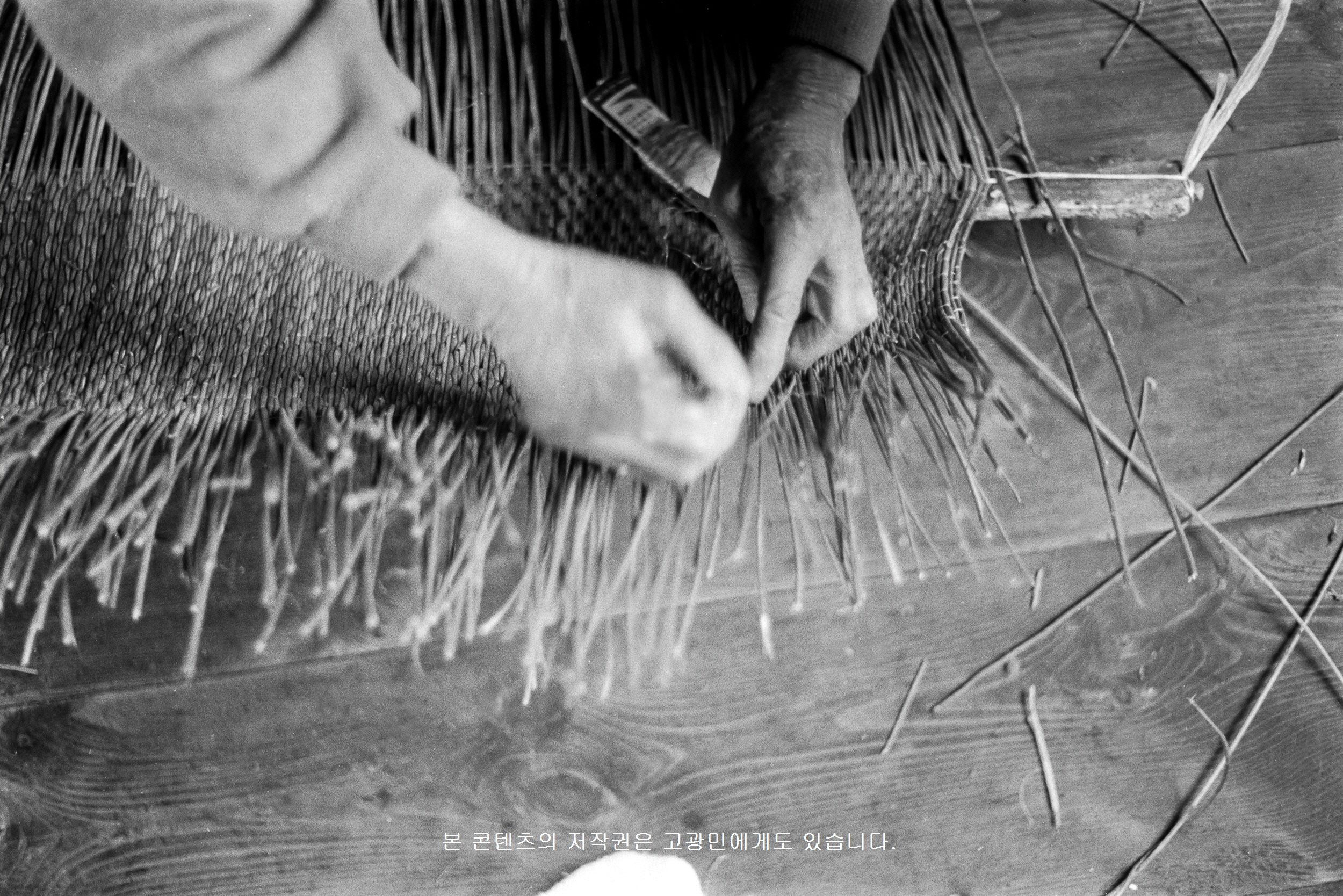 *개요 : 허 씨 어머니(1900년생)는 ‘푸는체’ 바닥 한쪽에 ‘징대’를 올려놓고, ‘푸는체’ 바닥 다른 쪽을 날줄로 엮고 있다. 이런 일을 ‘징 꾀기’라고 한다. ‘징대’는 ‘푸는체’ 바닥을 짜는데 쓰이는 연장이다. 나무로 만들었으며 자와 비슷하다. 양쪽 끝 가운데가 볼록하게 튀어나왔다. 길이는 80㎝, 폭은 4.5㎝ 정도이다. 이때의 날줄을 ‘징ᄂᆞᆯ’이라고 한다. ‘징ᄂᆞᆯ’은 ‘푸는체’를 만들 때 중심이 되는 것으로 ‘징대’에 두 줄로 건다.