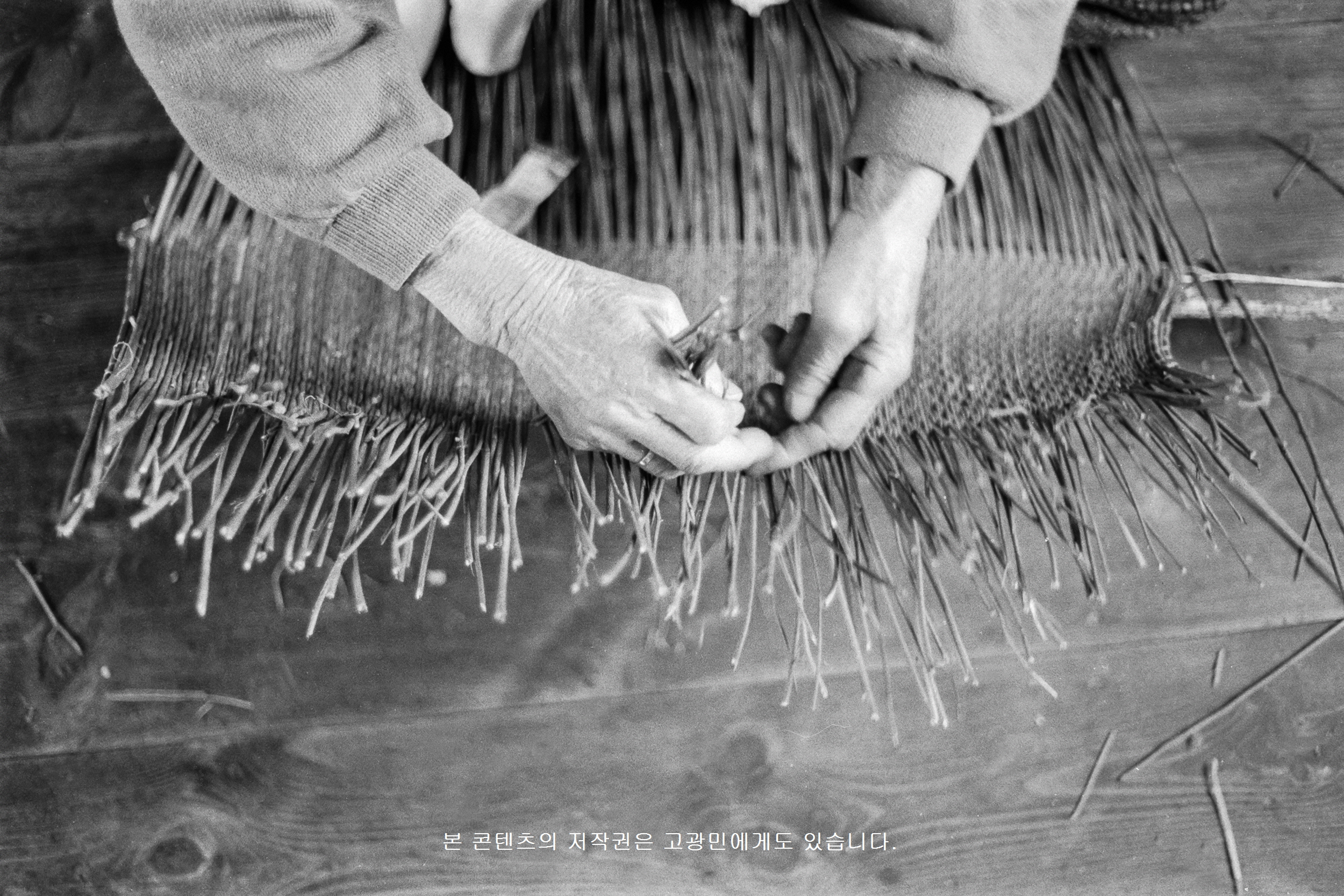 *개요 : 허 씨 어머니(1900년생)는 ‘푸는체’ 바닥 한쪽에 ‘징대’를 올려놓고, ‘푸는체’ 바닥 다른 쪽을 날줄로 엮고 있다. 이런 일을 ‘징 꾀기’라고 한다. ‘징대’는 ‘푸는체’ 바닥을 짜는데 쓰이는 연장이다. 나무로 만들었으며 자와 비슷하다. 양쪽 끝 가운데가 볼록하게 튀어나왔다. 길이는 80㎝, 폭은 4.5㎝ 정도이다. 이때의 날줄을 ‘징ᄂᆞᆯ’이라고 한다. ‘징ᄂᆞᆯ’은 ‘푸는체’를 만들 때 중심이 되는 것으로 ‘징대’에 두 줄로 건다.