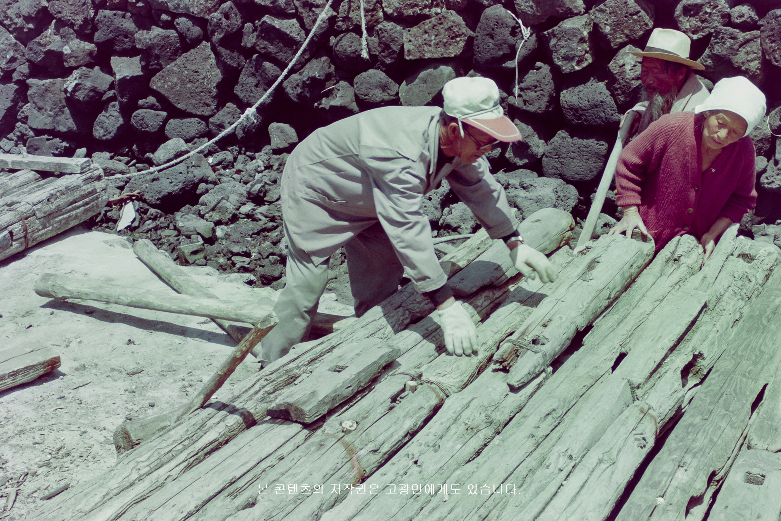 *연월일 : 1984년 8월 *장소 : 조천읍 신촌리 *개요 : 이 마을 강하림(1895년생, 남) 씨와 한평생을 같이 하였던 강 씨의 ‘테우’와 ‘자리(자리돔)’ 잡는 어구들이 인하대학교박물관으로 팔려나갈 준비를 서두르고 있다. ‘테우’를 조립하기 위하여 ‘장쇠’로 연결시키고 있다. ‘장쇠’는 통나무를 가지런히 놓았을 때, ‘테우’ 앞뒤 양쪽을 가로로 끼워 고정시키는 정사각형으로 다듬어 만든 나무토막이다.
