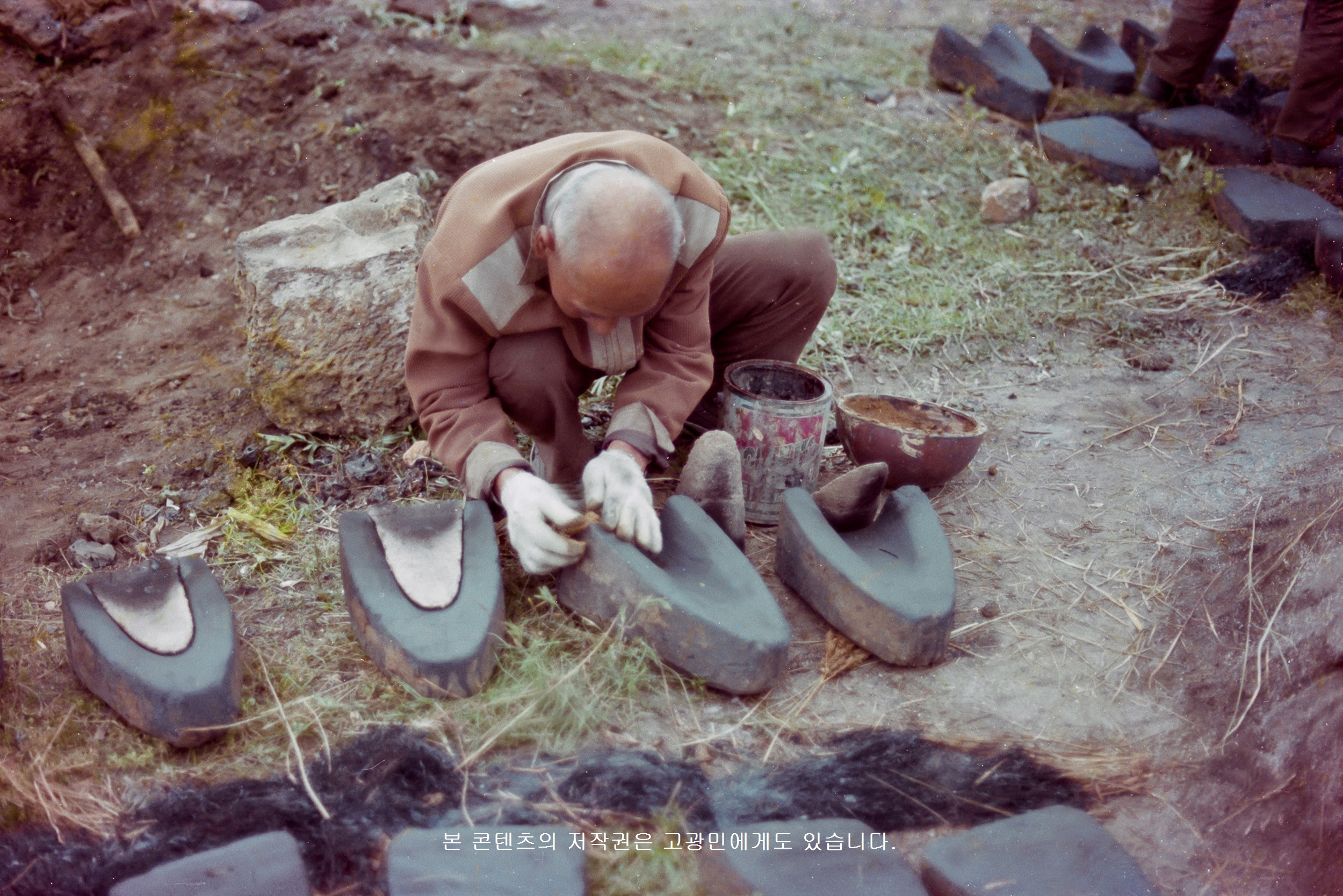 *개요 : 이긴 백토로 ‘보습뎅이’의 겉이 헐리거나 금이 간 부분을 메꿔주고 있다. 이런 일을 ‘보습뎅이 자신다.’고 한다. ‘알모살’이 있는 것으로 보아 마지막 손질이다.