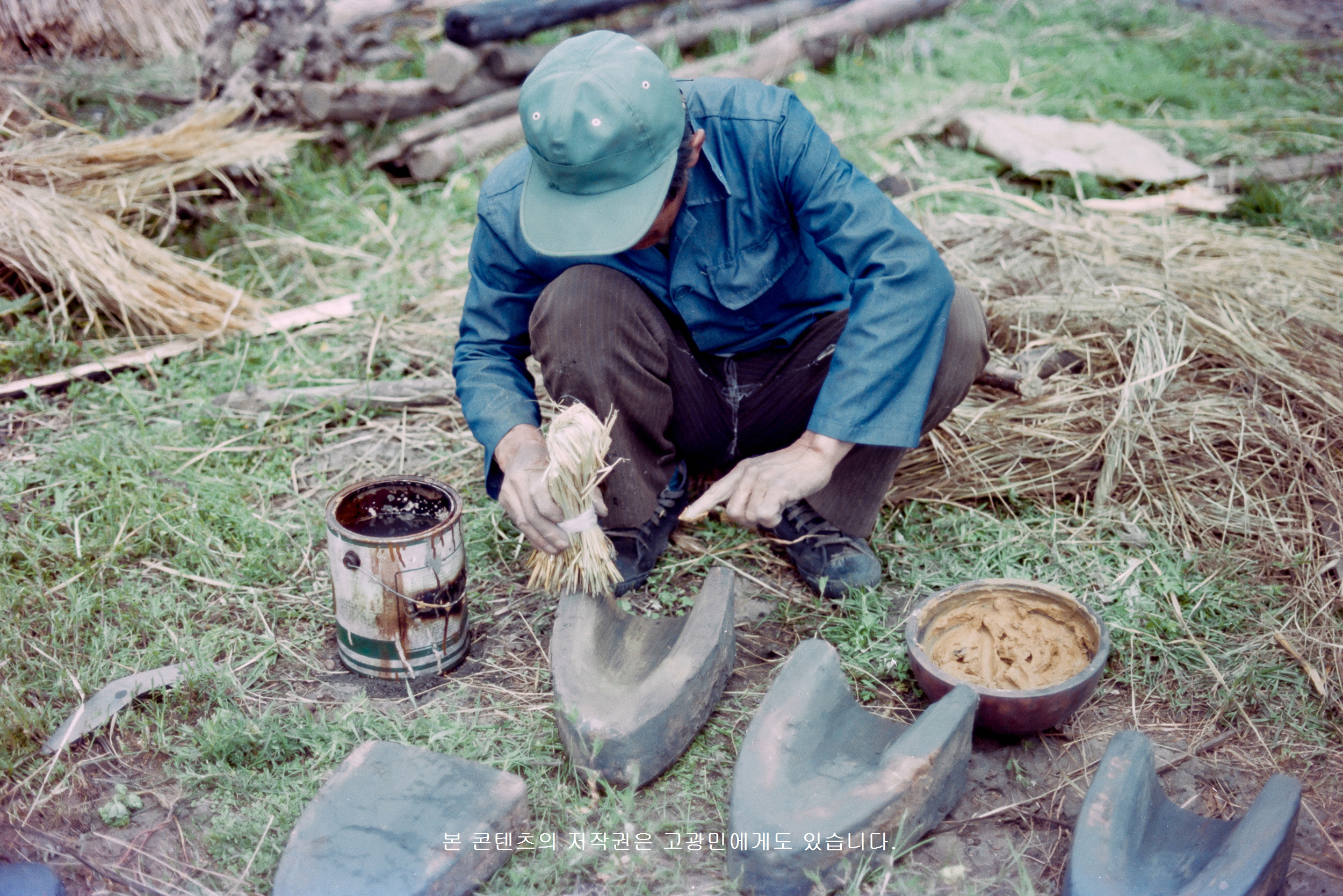 *개요 : 한 일꾼이 이긴 흙으로 ‘보습뎅이’의 겉이 헐리거나 금이 간 부분을 메꿔주고, ‘비얄’에 물을 적셔 쓸어주는 일이다. 이런 일을 ‘보습뎅이 자신다.’고 한다. 이때의 ‘비얄’은 즉석에서 짚을 휘감아 묶어 풀비처럼 만든 것이다.
