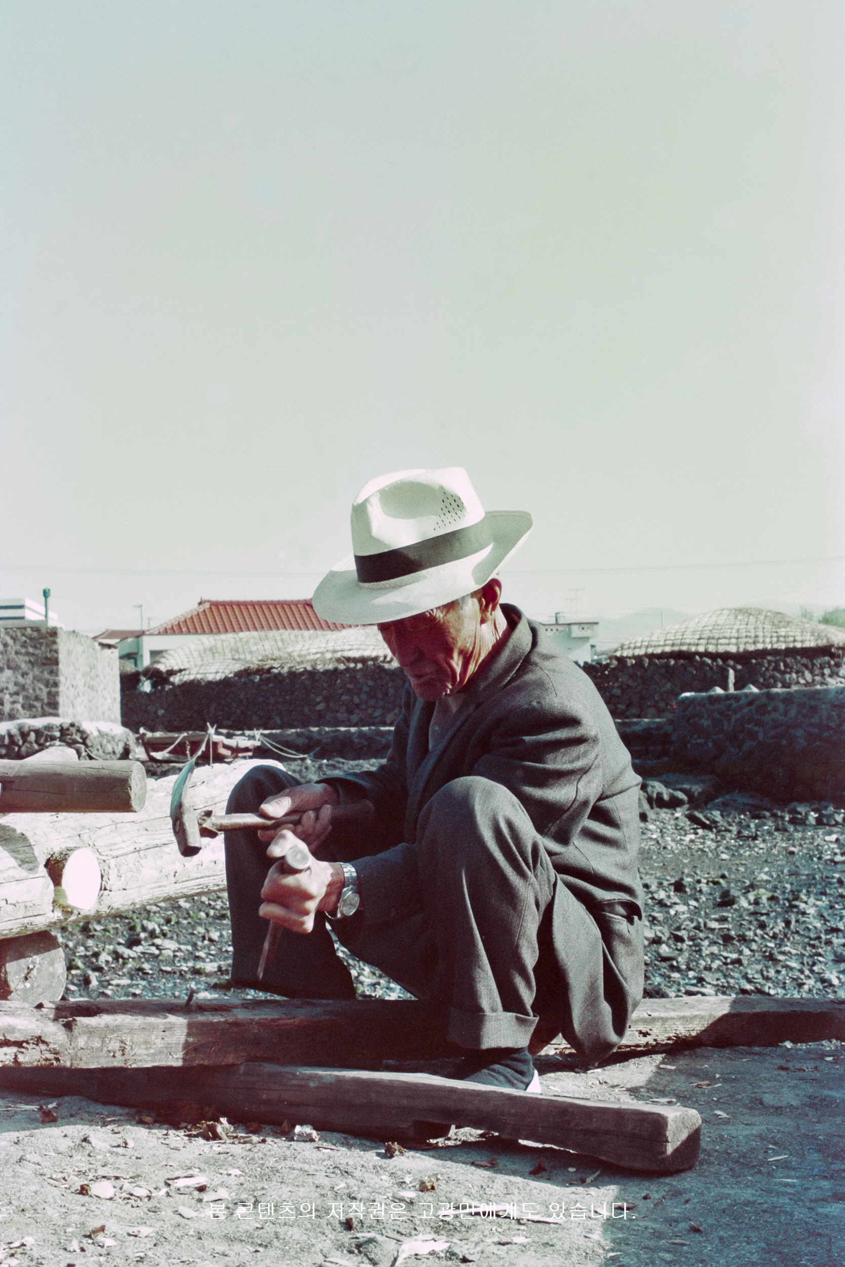 *개요 : 한 어부가 끌과 망치로 ‘테우’에 붙일 나무토막을 다듬고 있다.