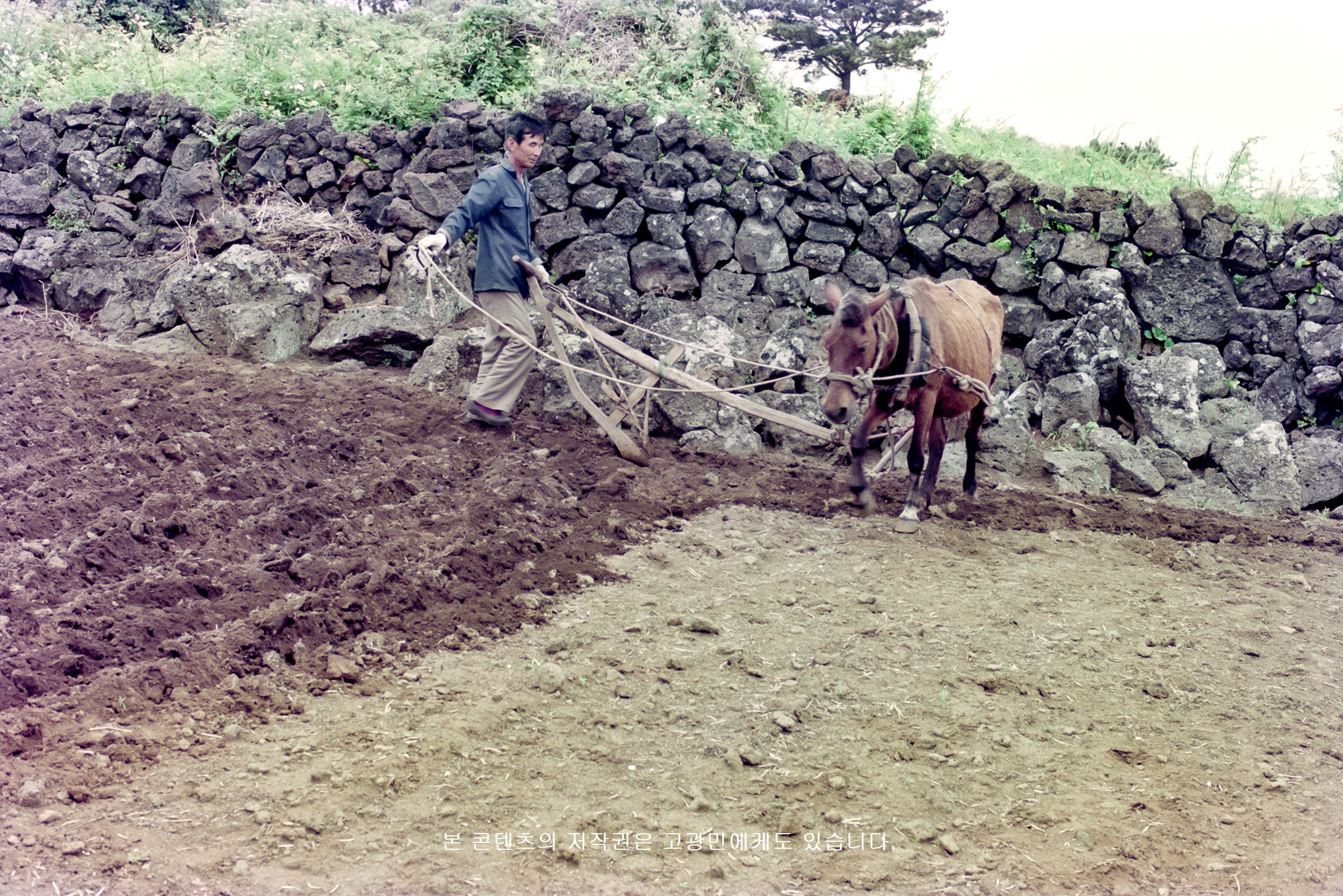 *개요 : 쟁기로 밭을 가는 동안 쟁기가 돌담에 이르자 쟁기를 돌려 세우고 있다. 이때 왼손에 잡은 줄을 들어올린다. 이때의 줄을 ‘가린석’이라고 한다. ‘가린석’은 여러 가지 기능을 겸비한 고삐다. 밭갈이 도중에 소가 일정한 방향에서 벗어나려고 할 때, 밭을 갈아 나가는 사람의 의도에 따라 쟁기의 방향을 바꾸기 위하여 소를 일정한 방향으로 돌려 세우려고 할 때, 소가 게으름을 피우며 쟁기를 끌지 않으려고 할 때 소를 어거하거나 채찍을 가하기도 하는 고삐다. 일반적으로 소의 양쪽 뿔에 묶은 후 멍에에 묶은 코걸이를 통과하고, 다시 ‘한테’가 묶인 ‘솜비줄’ 안쪽으로 빼내 쟁기의 손잡이 격인 ‘양주머리’까지 이른다. ‘가린석’ 끝에는 손잡이가 달려 있다. 이를 가린석코라 한다. ‘가린석코’는 윤노리나무를 고집한다. 한 번 휘어지면 그대로 고정되어 있는 성질을 갖고 있는 나무이기 때문이다.