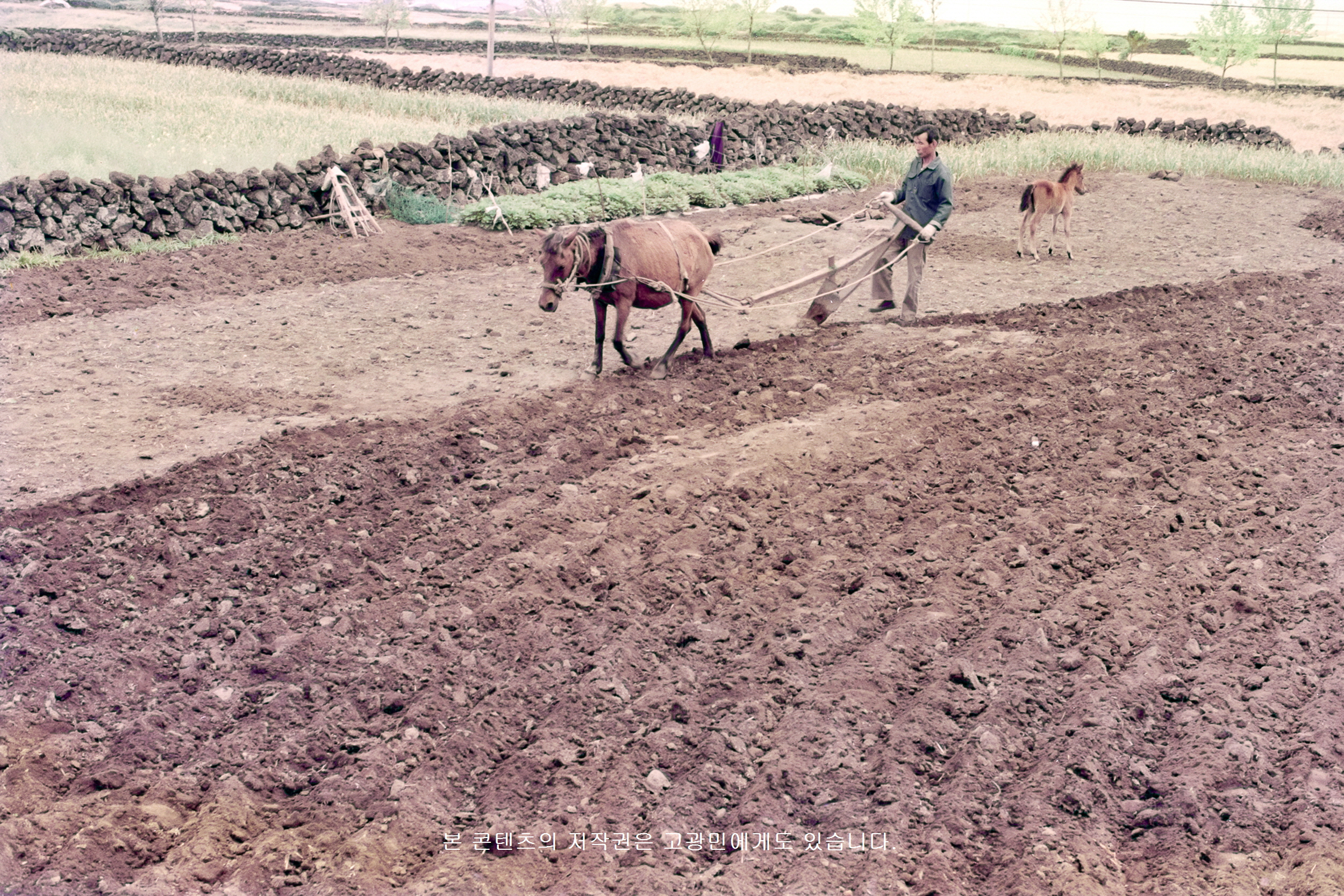 *개요 : 한 농부가 쟁기에 황소 대신 말[馬]을 채우고 밭을 갈고 있다. 제주도에서 말을 채워 밭을 갈기는 흔한 일은 아니다. 밭을 가는 동안 ‘빌레(너럭바위)’가 드러나자 양손으로 쟁기를 들어 올린 채 넘어서고 있다.