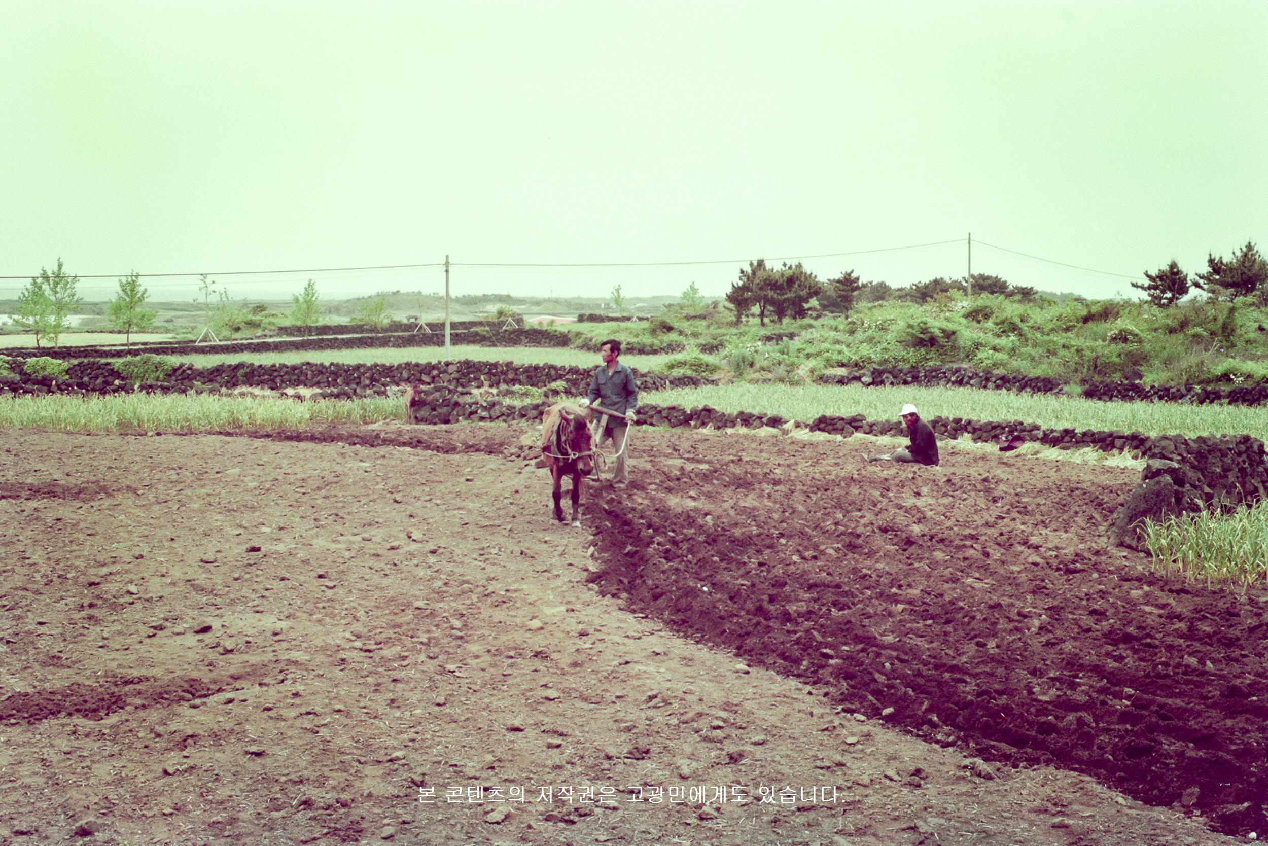 *개요 : 한 농부가 쟁기에 황소 대신 말[馬]을 채우고 밭을 갈고 있다. 제주도에서 말을 채워 밭을 갈기는 흔한 일은 아니다.