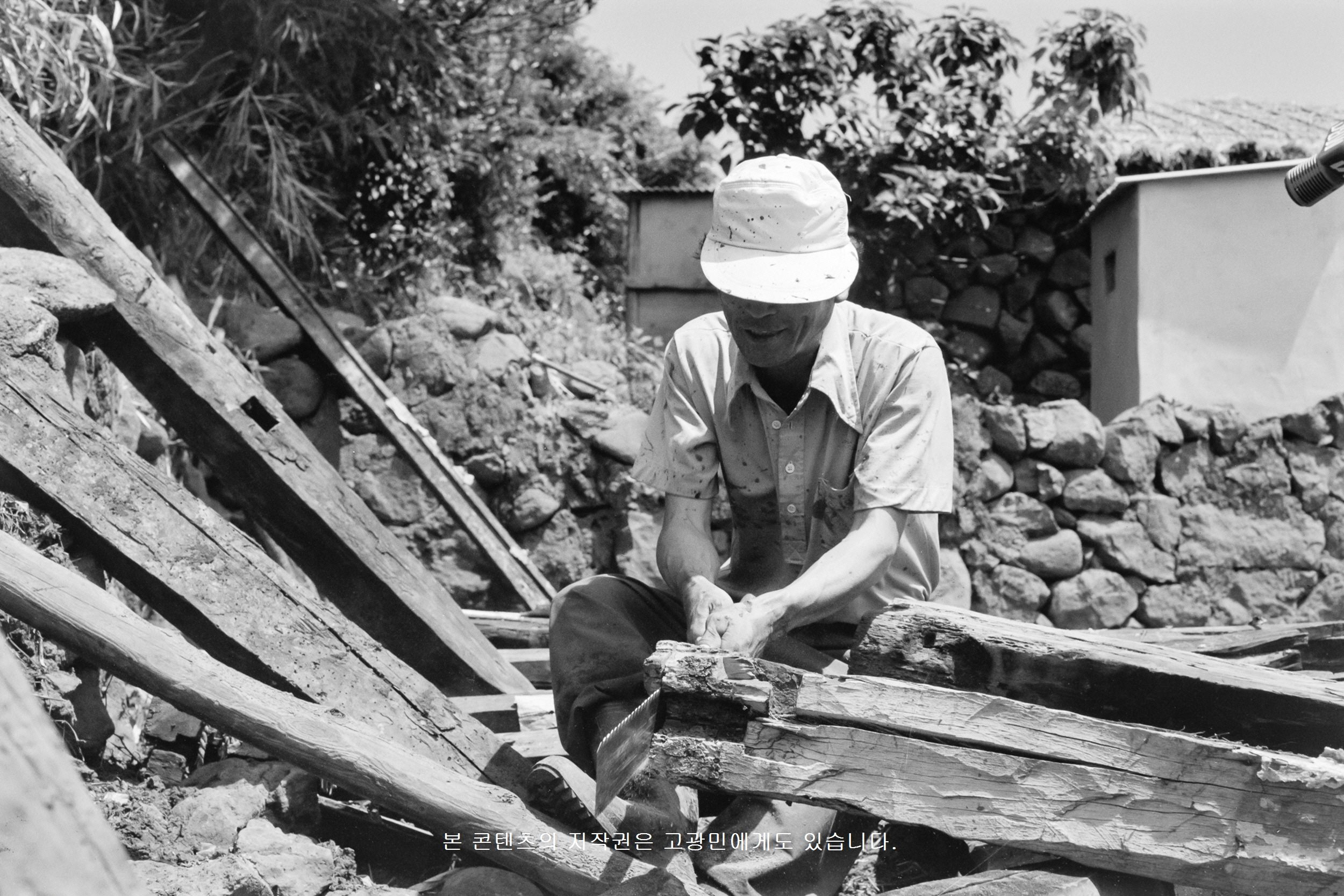 *개요 : 제주도 전통 민가를 복원하는 모습이다. 기둥을 주춧돌에 세우기에 앞서 기둥 밑을 톱으로 다듬고 있다.