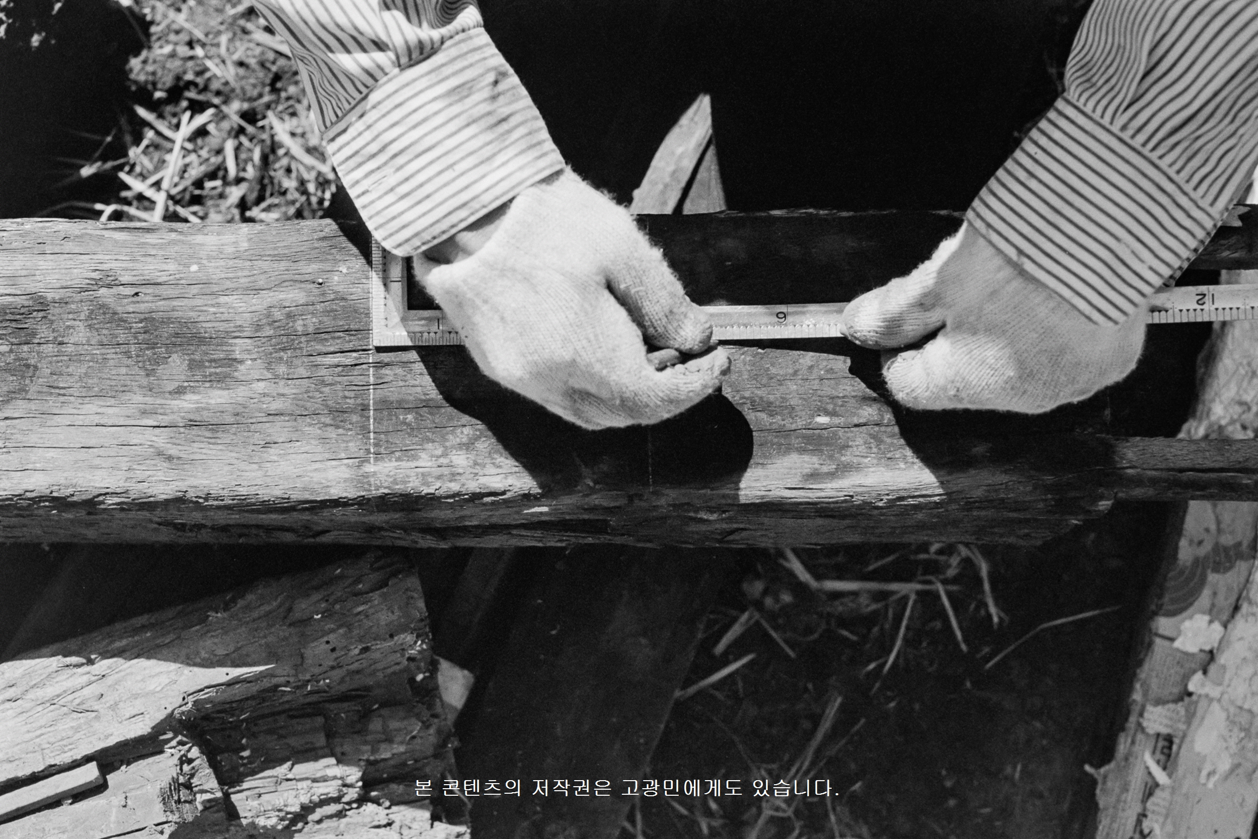 *개요 : 제주도 전통 민가를 복원하는 모습이다. 목수가 기둥에 ‘곱은자(곱자)’를 연필로 눈금을 그리고 있다.