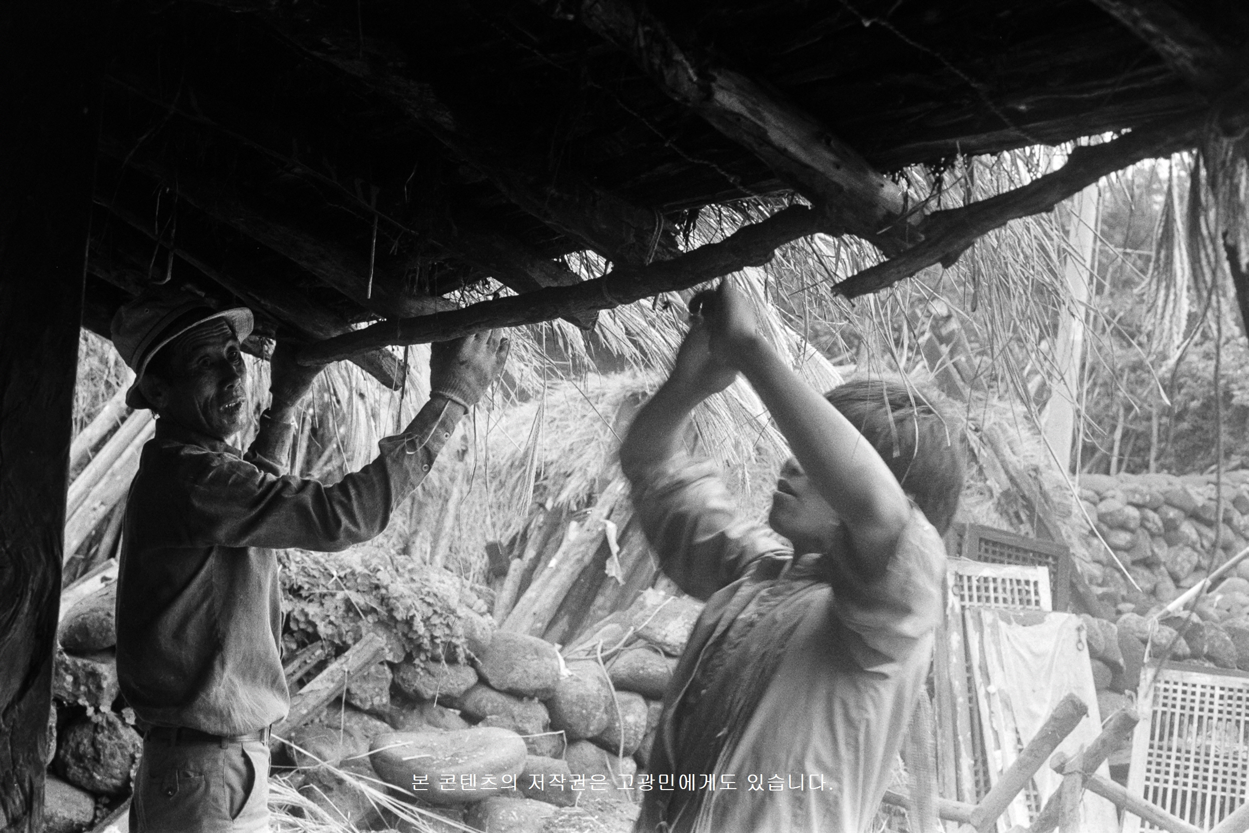 *개요 : 제주도 전통 민가를 복원하는 모습이다. 두 남정네가 ‘거왕’(처마 끝에 가로로 놓은 오리목)을 줄로 묶고 있다. ‘거왕’에 집줄을 묶기 위한 것이다. ‘집줄’은 지붕에 띠를 두껍게 펴 덮고, 그것을 바람에 날리지 않게 가로, 세로로 묶어주는 줄이다. 길이에 따라 ‘진줄’과 ‘ᄍᆞ른줄’이 있다. 이것을 양쪽 끝에서 힘껏 당기어 ‘거왕’에 맨다.