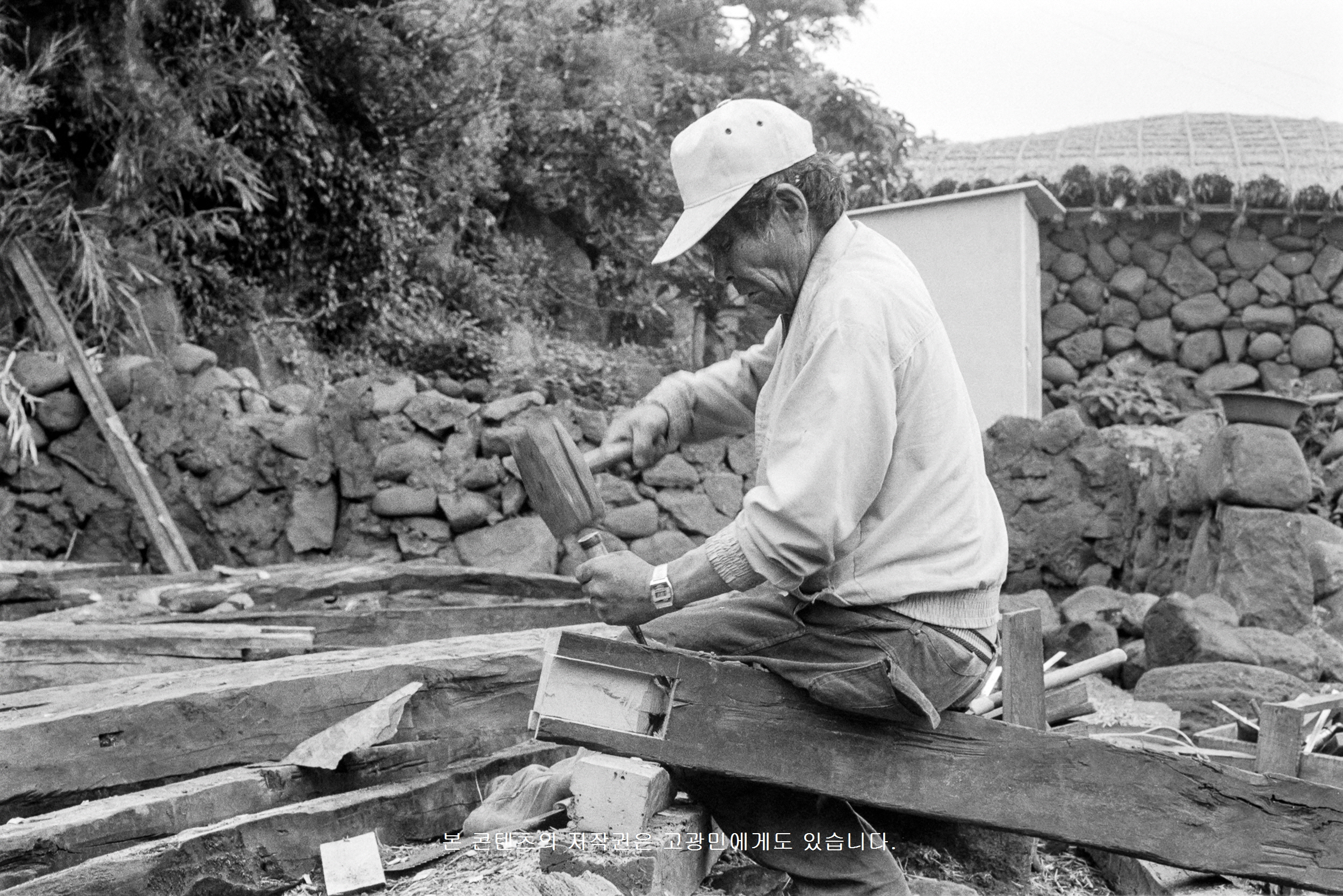 *개요 : 제주도 전통 민가를 복원하는 모습이다. 수목수가 사개맞춤을 위하여 수목수가 끌과 망치로 기둥머리를 따고 있다. 사개맞춤은 사방의 보나 도리가 기둥 위에서 맞춰지도록 이들과 기둥머리를 따 내서 엇갈리게 끼워 맞추는 것이다.