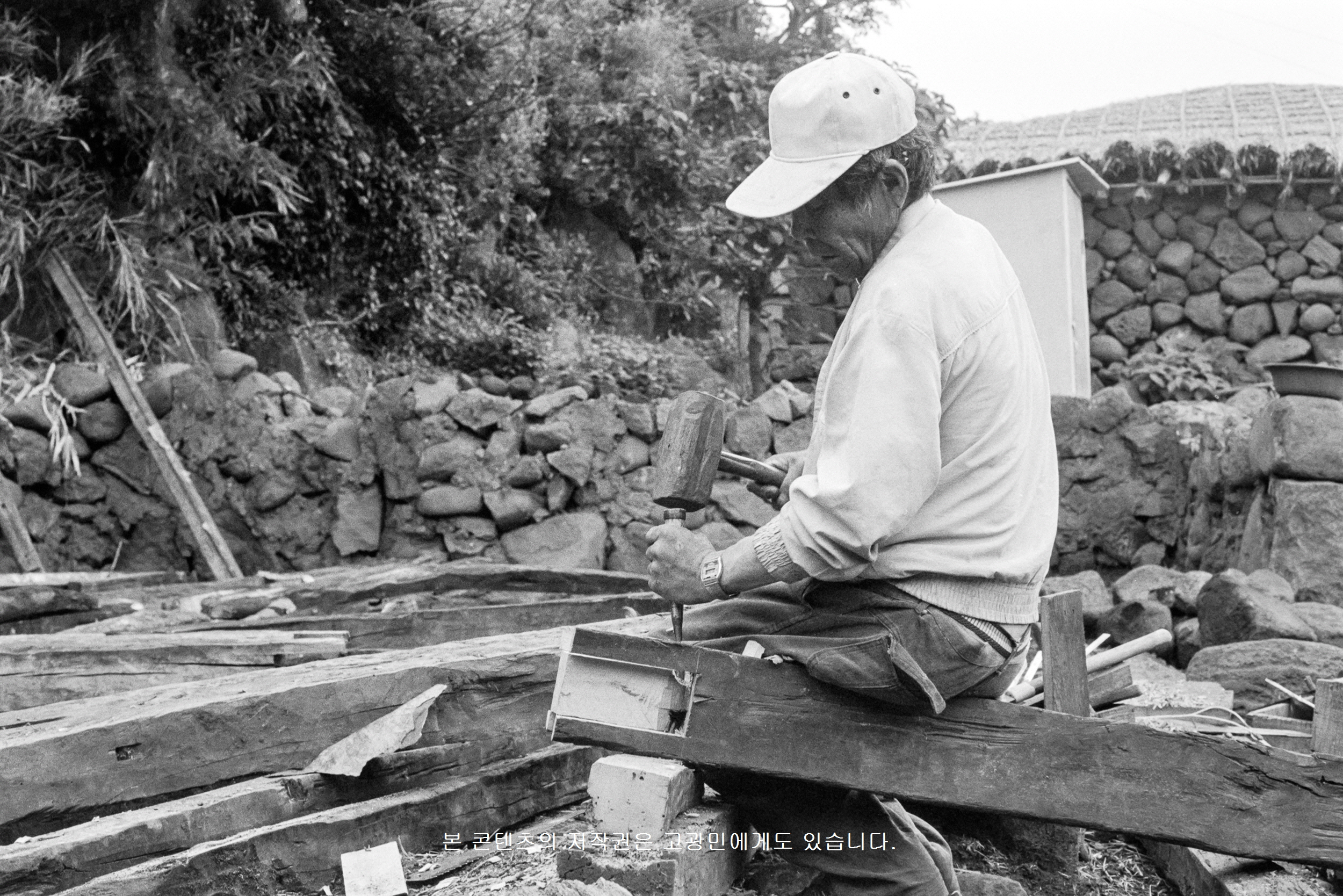 *개요 : 제주도 전통 민가를 복원하는 모습이다. 수목수가 사개맞춤을 위하여 수목수가 끌과 망치로 기둥머리를 따고 있다. 사개맞춤은 사방의 보나 도리가 기둥 위에서 맞춰지도록 이들과 기둥머리를 따 내서 엇갈리게 끼워 맞추는 것이다.