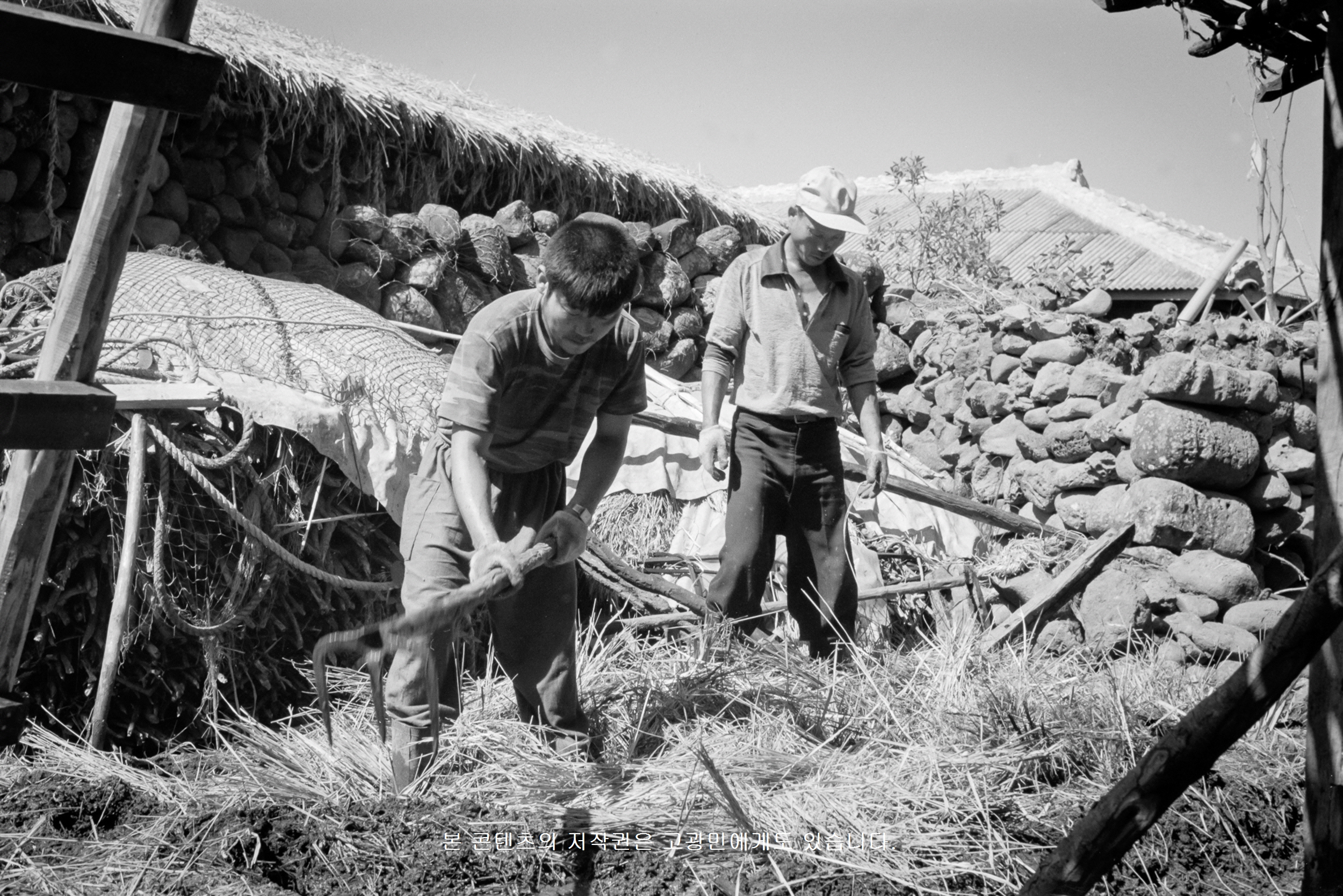 *개요 : 제주도 전통 민가를 복원하는 모습이다. 남정네 두 사람이 쇠스랑으로 초가지붕 위에 올려놓을 흙 위에 볏짚을 깔아놓고 쇠스랑으로 이기려고 하고 있다.