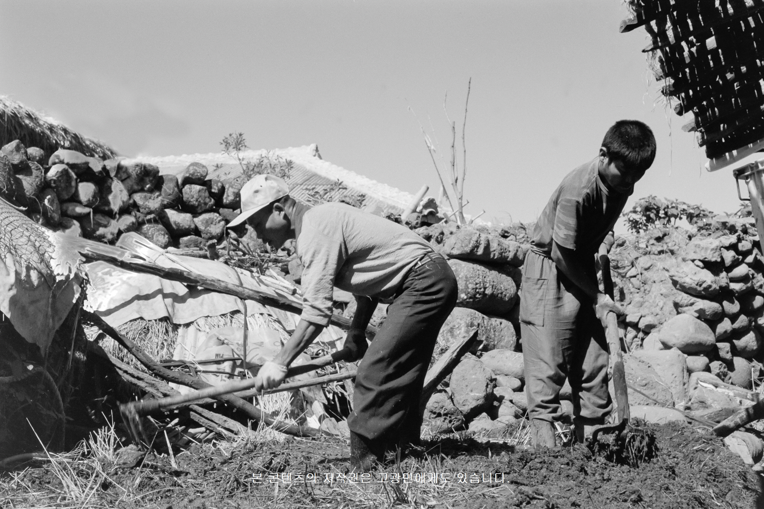 *개요 : 제주도 전통 민가를 복원하는 모습이다. 남정네 두 사람이 쇠스랑으로 초가지붕 위에 올려놓을 흙과 보릿짚을 이기고 있다.