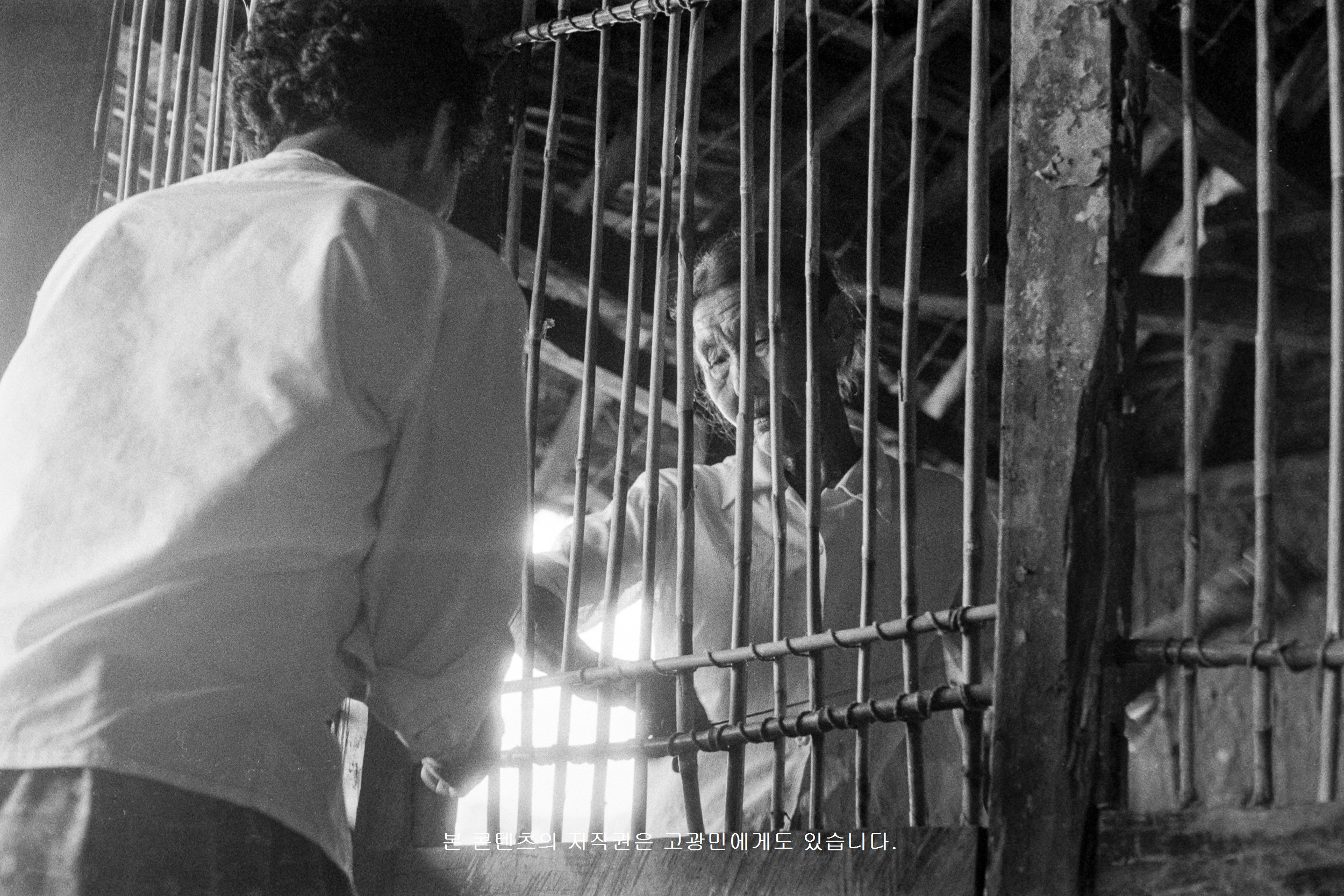 *개요 : 제주도 전통 민가를 복원하는 모습이다. 여인 두 사람이 마주 서서 흙벽을 바르기에 앞서 벽 속에 ‘수리대(구릿대)’를 엮고 있다. 이때의 ‘수리대’를 ‘퉤기’라고 한다.