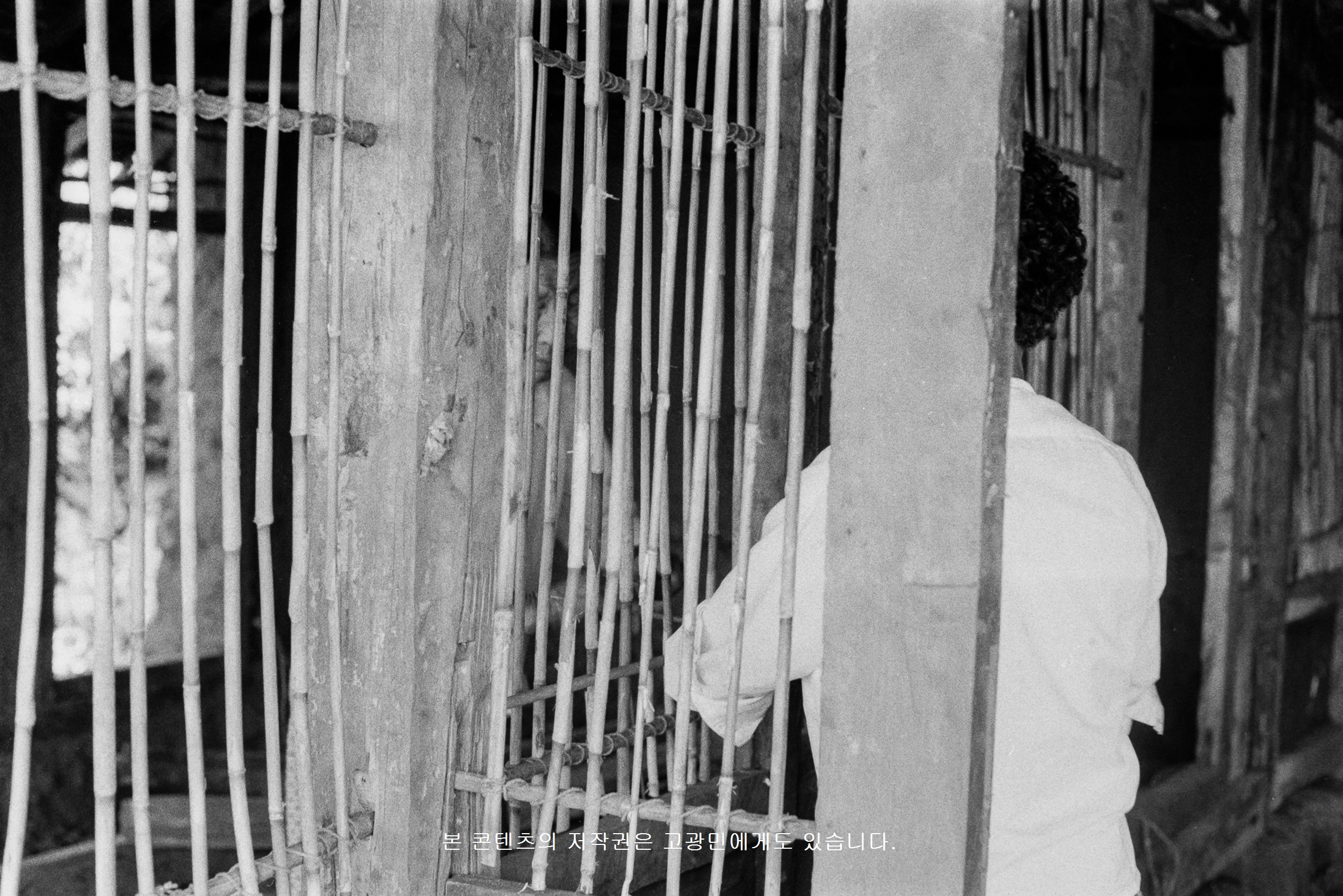 *개요 : 제주도 전통 민가를 복원하는 모습이다. 흙벽을 바르기에 앞서 벽 속에 ‘수리대(구릿대)’를 엮고 있다. 이때의 ‘수리대’를 ‘퉤기’라고 한다.