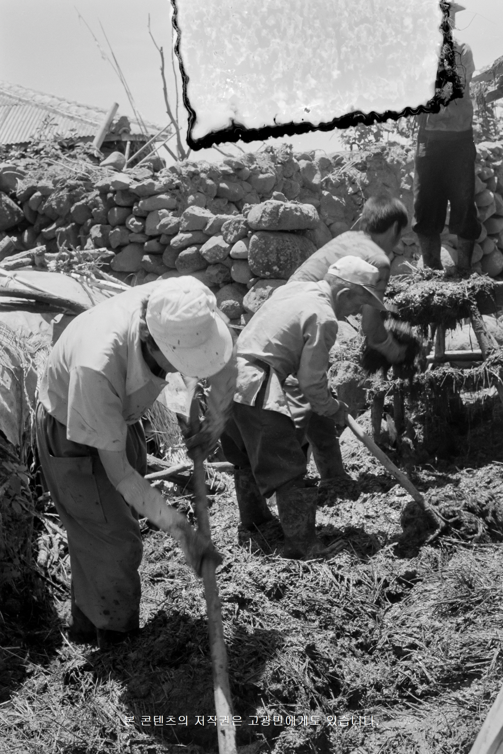 *개요 : 제주도 전통 민가를 복원하는 모습이다. 쇠스랑으로 초가지붕 위에 올려놓을 흙을 이기고 있다. 쇠스랑으로 찰흙과 보릿짚을 잘 이기고 있다.