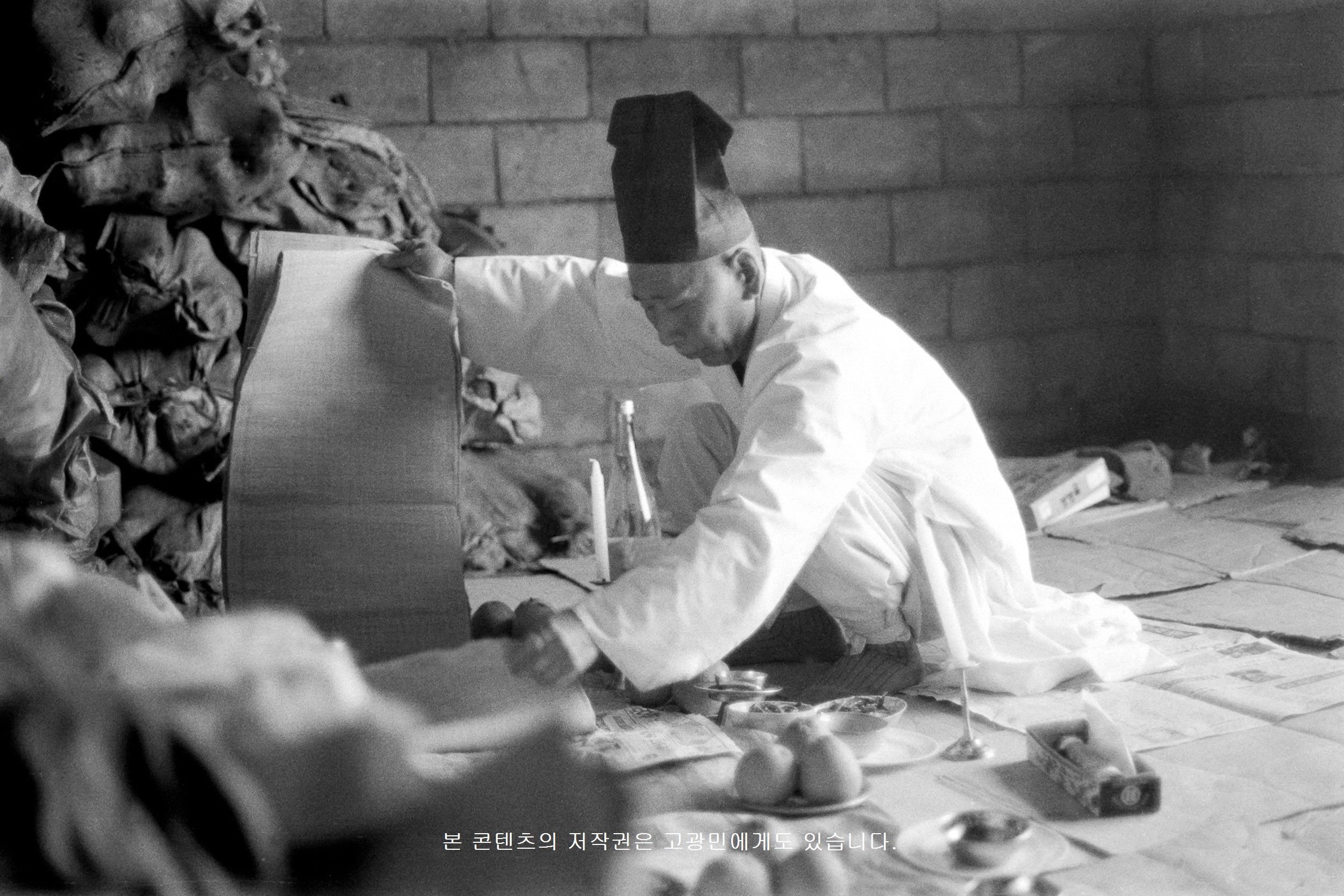 *개요 : ‘원대장’이 풀무를 관장하는 신에게 유교식 제사를 올리기에 앞서 삼베를 펴고 있다. ‘원대장’은 불미마당의 주인으로, 자본을 대어 물자를 준비하고, 일꾼들에게 품삯을 주는 사람이다.