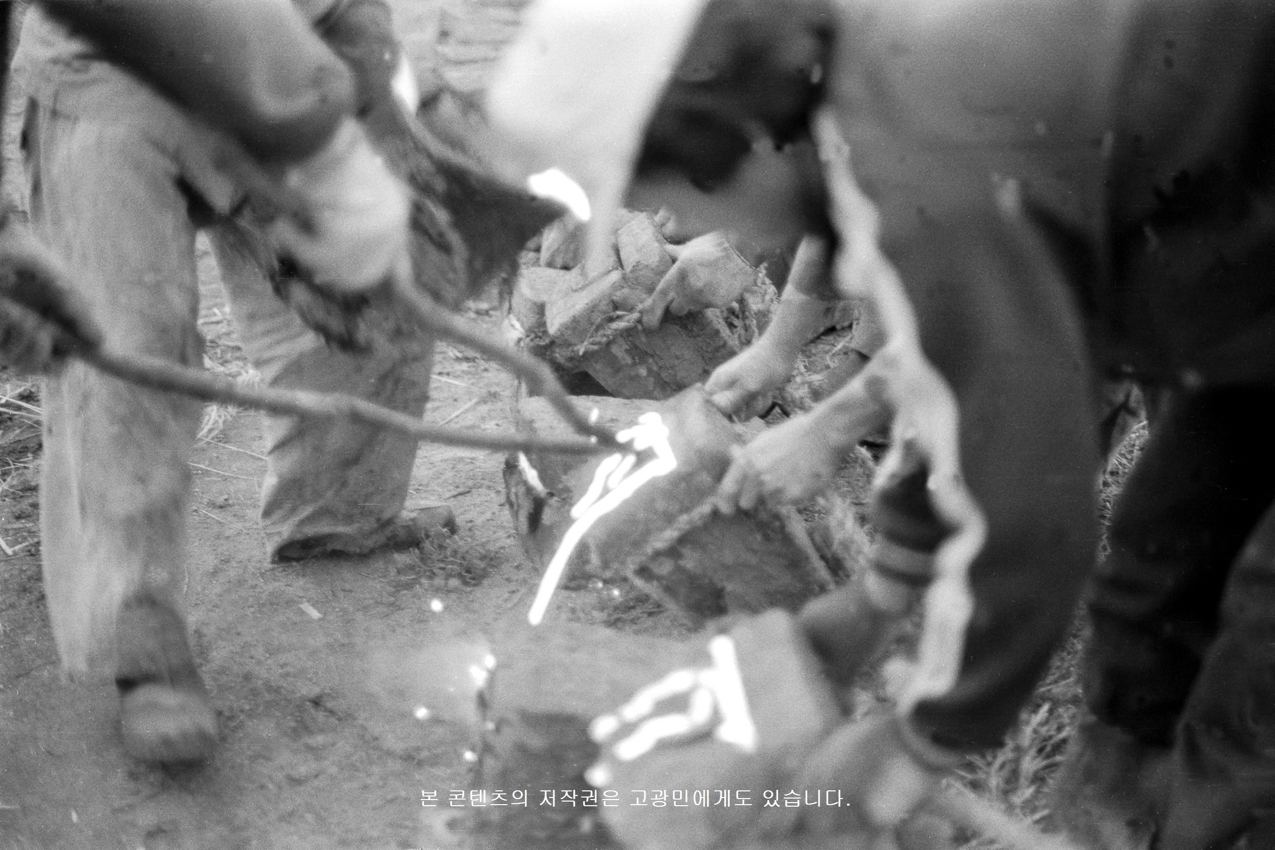 *개요 : ‘잿대장’이 ‘오시장테’에 들고 온 쇳물을 ‘무십’ 구멍으로 붓는 동안 ‘원대장’은 두 개의 막대기로 ‘알모살’을 살짝 눌러주고 있다. 이런 일을 알 짚음이라고 한다.‘잿대장’은 대장일에서 쇳물을 틀에 부어넣는 사람이고, ‘원대장’은 불미마당의 주인으로, 자본을 대어 물자를 준비하고, 일꾼들에게 품삯을 주는 사람이다.