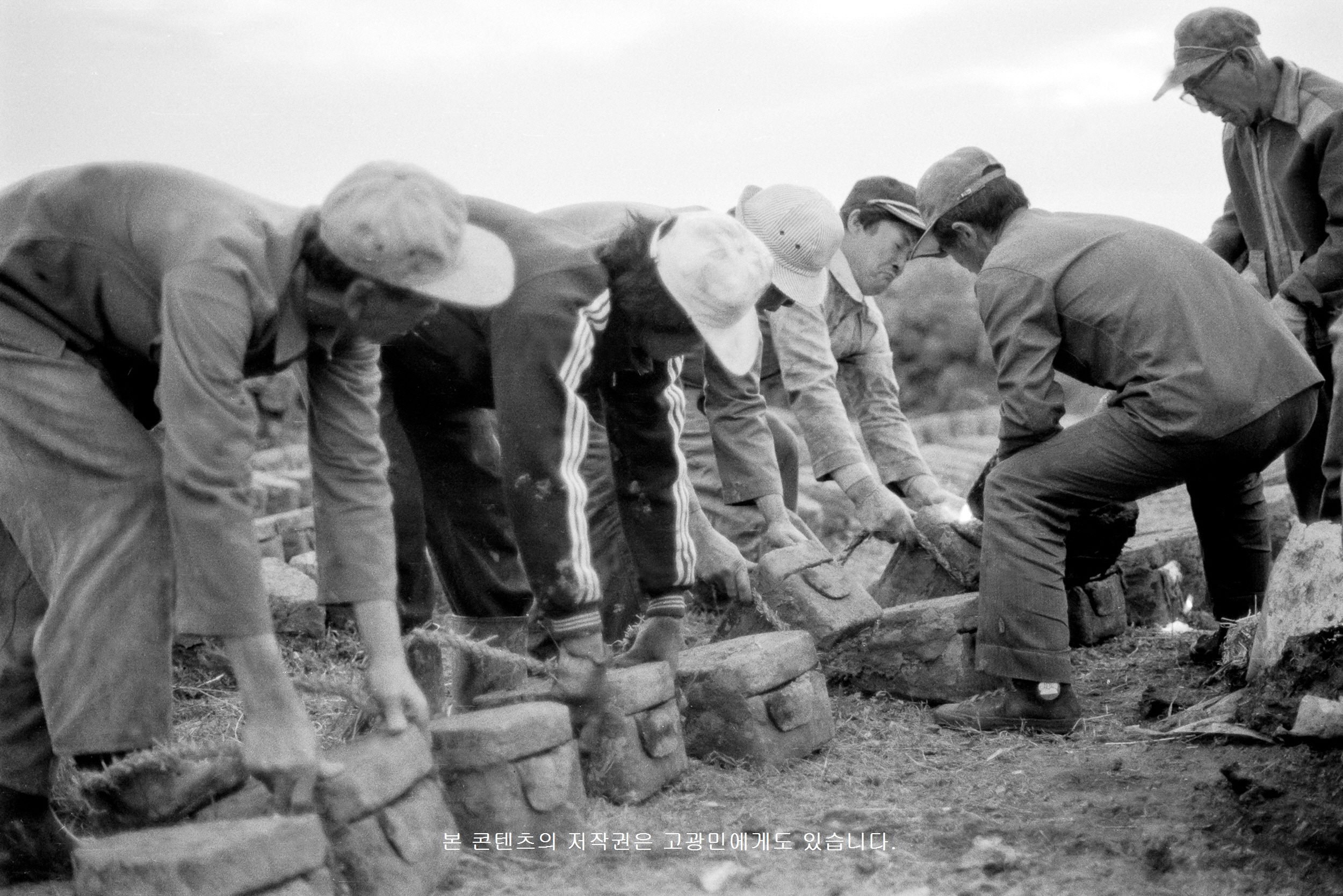 *개요 : 잡일꾼들은 ‘뎅잇배’라는 밧줄을 잡고 엄지손으로 ‘보습뎅이’를 살짝 눌러주며 반쯤 일으켜 세우고 있다. ‘보습뎅이’는 대장일에서 보습을 주조할 때의 주형이다. 이런 일을 ‘보습뎅이 세움’이라고 한다. ‘원대장’은 두 개의 막대기로 ‘알모살’을 살짝 눌러주고 있다. 이런 일을 ‘알 짚음’이라고 한다. ‘잿대장’은 ‘오시장테’에 들고 온 쇳물을 ‘무십’ 구멍으로 붓고 있다. ‘원대장’은 불미마당의 주인으로, 자본을 대어 물자를 준비하고, 일꾼들에게 품삯을 주는 사람이고, ‘잿대장’은 대장일에서 쇳물을 틀에 부어넣는 사람이다.