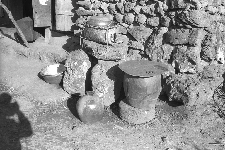 * 개요 : 정지(부엌) 입구에 만들어 놓은 물팡과 그 위에 물허벅이 있다. 물팡은 물허벅을 담은 구덕(대바구니)을 질 때 사용하는 돌 받침대이다. 돌로 받침대를 만들고 그 위에 넓적한 돌을 놓아 물구덕을 놓았다. 선 채로 물허벅을 질 수 있게 축조한 구조물로 물구덕을 지고 벗는데 편리성을 준다. 물허벅은 대바구니 속에 허벅을 넣어 밧줄로 등에 져서 샘이나 공동수도에서 물을 길어 나르는 용도로 사용했다. 가정마다 수도가 없을 때 물을 길어 오는 일은 여자들의 몫이었다. 주부들만 아니라 여자 아이들도 보통 학교 들어갈 정도의 나이가 되면 어머니에게 물 긷는 법을 배워 물을 길어다 정지의 물항(항아리)을 채워 놓았다. 동네에 잔치집이 있으면 동네 여자들은 자기 집의 물허벅을 지고 나와 모두 합심하여 식수를 길어다 주는 것이 큰 부조였다. 그 만큼 제주도가 예로부터 식수가 귀했다. 여자들의 고된 노동이었지만 필요한 생활용수였기에 하루도 빠짐없이 물을 길어 날랐다.