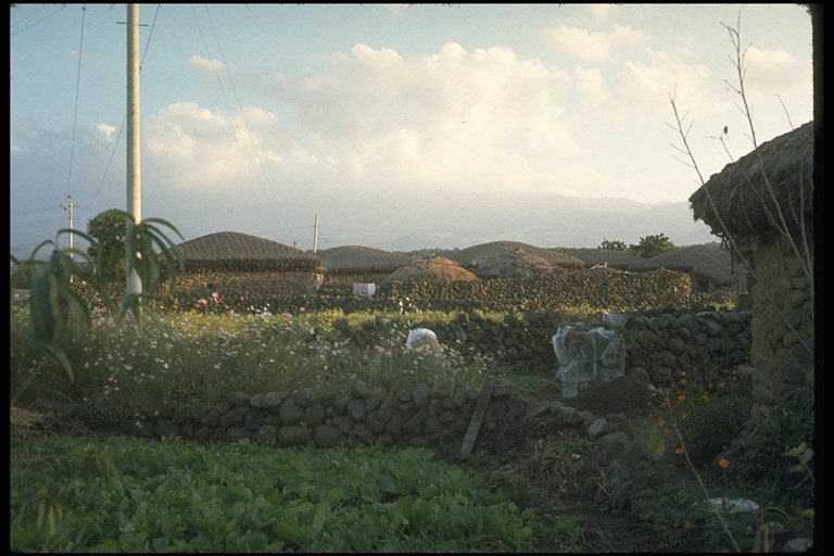 * 연월일 : 1971년 8월~10월 * 장소 : 미상 * 개요 : 초가집 울담 안에 코스모스가 잔뜩 피어 있다. 초가을에 접어든 시기인가 보다. 건너편 가옥에는 ‘눌’이 쌓여 있고 돌담이 가지런히 높이 쌓여 있다. 채소들도 싱싱하게 자라고 있다. 농가의 아득하고 정겨운 풍경이다.