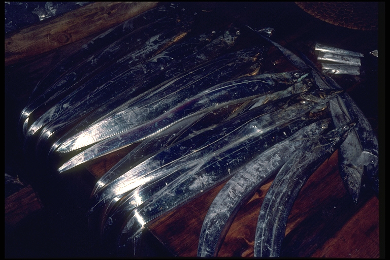 * 개요 : 동문시장 어물전의 갈치이다. 크기가 요즘 갈치보다는 좀 작은 느낌이지만 예나 지금이나 갈치는 인기 좋은 생선 중의 하나로 사람들이 많이 사서 먹었다. 예전에는 사람들이 호박 갈치국을 끓이거나 조림이나 구이로 많이 만들어서 먹었다. 최근에는 갈치 값이 너무 비싸 서민들의 먹거리라 할 수 없을 정도이다. 그 만큼 바다에서의 어획량이 줄고 먹는 사람 수가 많아졌다는 의미일 것이다.