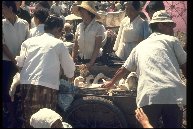 * 개요 : 서사라 사거리 오일장에서 오리를 팔기 위해 마차에 가득 실어왔다. 많은 오리를 가져와 파는 것으로 보아 전문적으로 오리를 키워 파는 상인인 것 같다. 아주머니들이 구입을 하려는지 구경하며 모여 있다. 제주시 오일장 장터는 1910년대 관덕청 광장에서 비롯해 1960년대 중후반까지 건입동 관할 탑동 주변에서 열렸다. 이후 1969년 12월부터 1974년 11월까지는 삼도2동 현 서사라 사거리에서, 1974년 12월부터 1982년 6월까지는 용담1동 현 적십자회관 주변에서 운영되었다. 그 후 수차례 다른 장소로 이동해서 장터가 형성되었다가, 현재 오일장 장터인 제주시 도두1동 1212번지 일대로 옮겨 유지되고 있다. 계속적으로 현대화 사업을 추진함에 따라 제주도내의 가장 큰 오일시장으로서의 면모를 갖추고 있다.