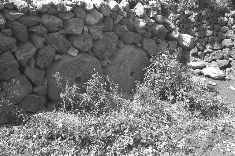 * 개요 : 제주도는 ‘돌의 고장’이라 할 만큼 온통 돌로 둘러싸인 석다(石多) 의 섬이다. 밭을 개간해도, 집터를 닦아도, 바다로 나가도 돌을 피할 수 없는 환경으로 제주사람들은 생활 속에서 돌을 매우 잘 이용해 오며 살아왔다. 마치 그물처럼 얼기설기 쌓아 놓은 돌담은 바람 영향이 심한 제주의 자연 환경을 극복하며 살아온 제주사람들의 지혜를 엿볼 수 있다. 돌담은 강한 바람의 거칠음을 부드럽게 만들어 주는 완충 역할을 하여 가옥과 밭을 보호하였다. 또 제주의 돌은 생활도구, 방어 경계, 생산, 신앙 등 일상생활 속에서 여러 쓰임새가 있었다. 사진에서는 사용하지 않는 말방아(연자매)의 둥근 웃돌을 받침돌로 이용하여 돌담을 쌓고 있다. 제주도의 ‘돌담’은 2006년 문화관광부의 100대 민족문화상징물의 하나로 지정되었다.