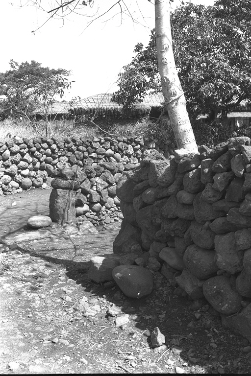 * 개요 : 오라1동 마을 풍경이다. 초가지붕과 큰 나무, 정교하게 쌓여진 돌담과 대문 없는 문이 당시 제주 가옥과 마을 풍경을 잘 보여주고 있다.