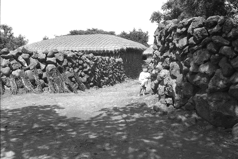 * 개요 : 1971년 오라1동 마을의 골목길로 초가지붕이 새끼줄로 단단하게 묶여있고 돌담이 가지런히 잘 쌓여 있다. 돌담에 기대어 수확한 참깨를 말리고 있는 농촌마을 풍경을 보여준다. 3~4세 어린 아이가 사진 찍는 사람들을 응시하는 듯 의젓하게 서 있다.