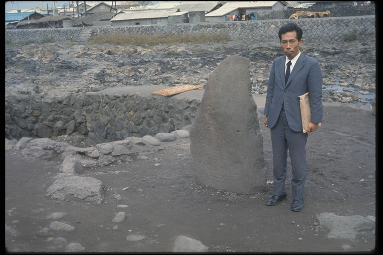 * 개요 : 용출수가 솟아났던 동한두기길에 세워져 있는 선반수(仙盤水) 표석 앞에 故 현용준 교수가 서있다. 48년 전 사진이라 젊은 모습의 현용준 교수이다. 세월유수를 실감케 한다. 이곳 병문천 하류에 선반수, 즉 선반물이라는 밀물이 되면 바닷물 속에 잠겨 버리지만 용출량이 많은 산물이 있었다. 한두기 마을 사람들이 식수용이나 빨래용으로 많이 이용했다. 그러나 병문천 복개공사로 없어져 버리고 지금은 표석만이 남아 있을 뿐이다.