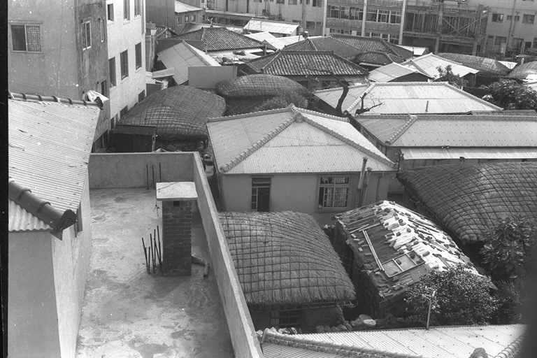 * 개요 : 사진을 찍은 일본 연구자 이토 아비토(伊藤亜人) 선생이 머물렀던 한일여관은 제주시 동문시장에서 칠성로 옛 제일극장으로 이어지는 샛목골에 있었다. 이 샛몰골에는 옥림여관, 반도여관 등 숙박업소들이 많았다. 사진은 한일여관에서 바라본 가옥 풍경이다. 슬레이트집, 초가집, 2층 건물들이 모여 있고, 2층 건물을 짓고 있기도 하다. 2층 건물들이 있는 곳은 칠성로 거리 같다. 흔히 칠성통이라 부르는 칠성로 거리는 1970년대 상가들이 즐비하게 들어서 있는 제주시내의 상권 중심지였다.
