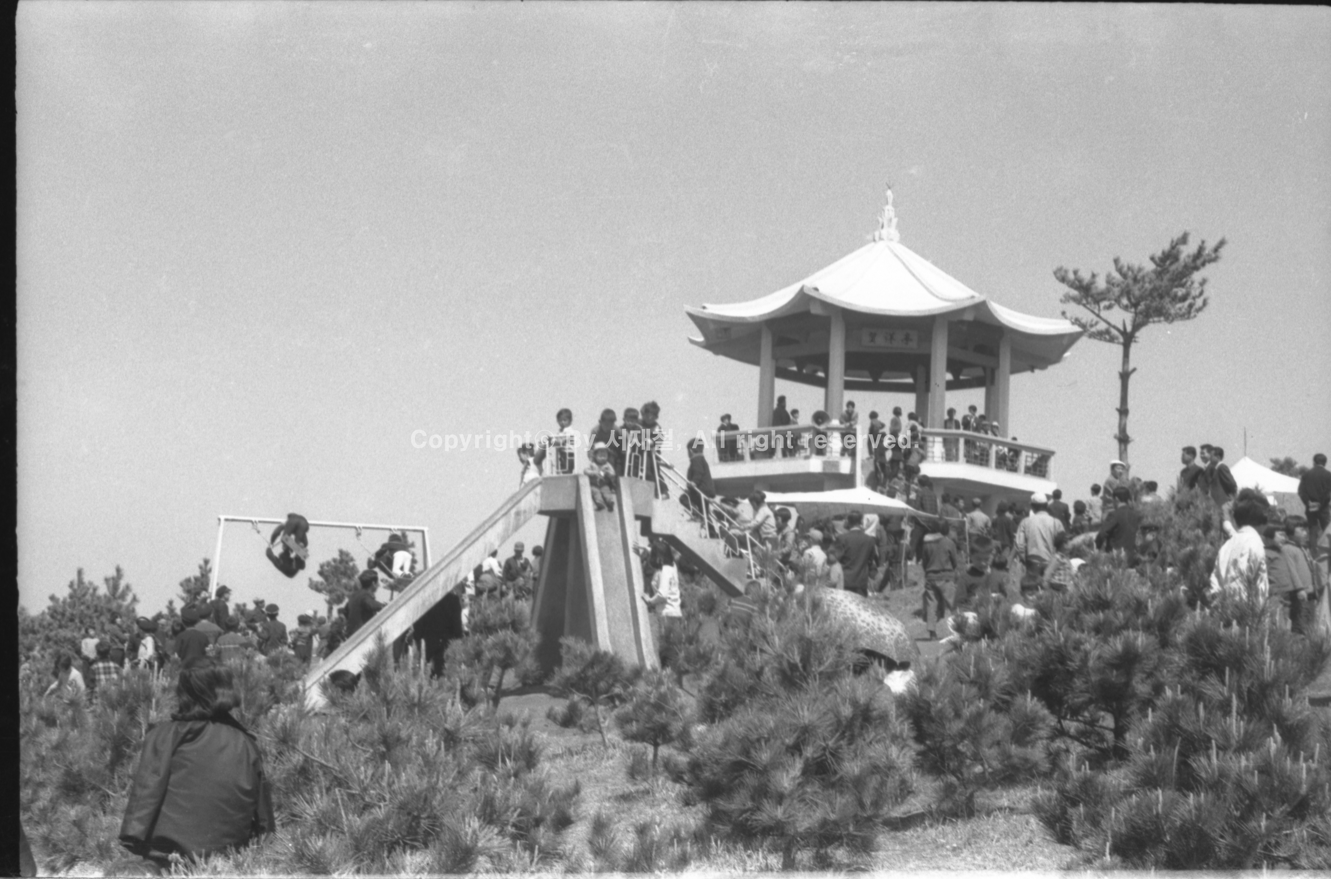 제주시민의 유일한 공원이었던 사라봉 공원 팔각정(흰색) 모습이다. 많은 사람들이 휴식지로, 학교에서는 소풍 장소로 찾곤 하였다.