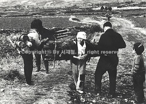 땔감으로 나무를 사용하던 시절 산에서 나무를 하고 돌아오던 주민들이 영림소 직원이 단속하고 있다.