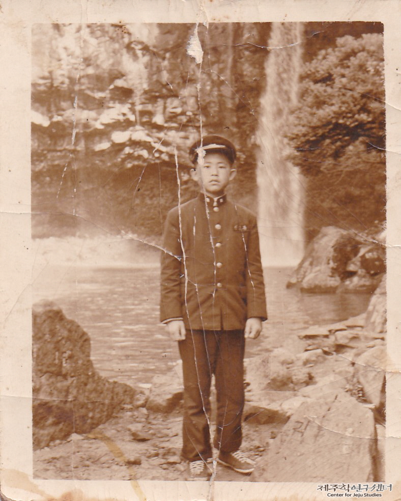 소장자 강홍종 씨가 귀일중학교 2학년 때 서귀포 천지연폭포에서 촬영한 수학여행 기념사진이다. 교복 차림에 교표가 달린 모자를 착용하고 있다. 당시 귀일중학교는 남학생 반 2개, 여학생 반 1개로 총 3개 학급으로 구성되어 있었다고 한다.