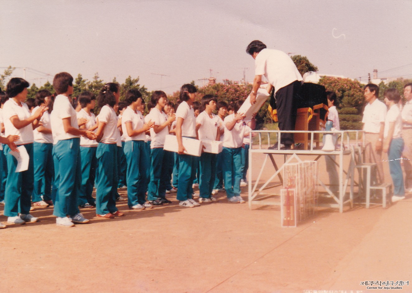 1984년 5월, 제주여자상업고등학교 체육대회 경기를 모두 마치고 진행된 시상식 장면이다. 단상 위에 오른 선생님이 학생에게 부상을 수여하고 있고 같은 반 학생들이 박수를 보내고 있다.