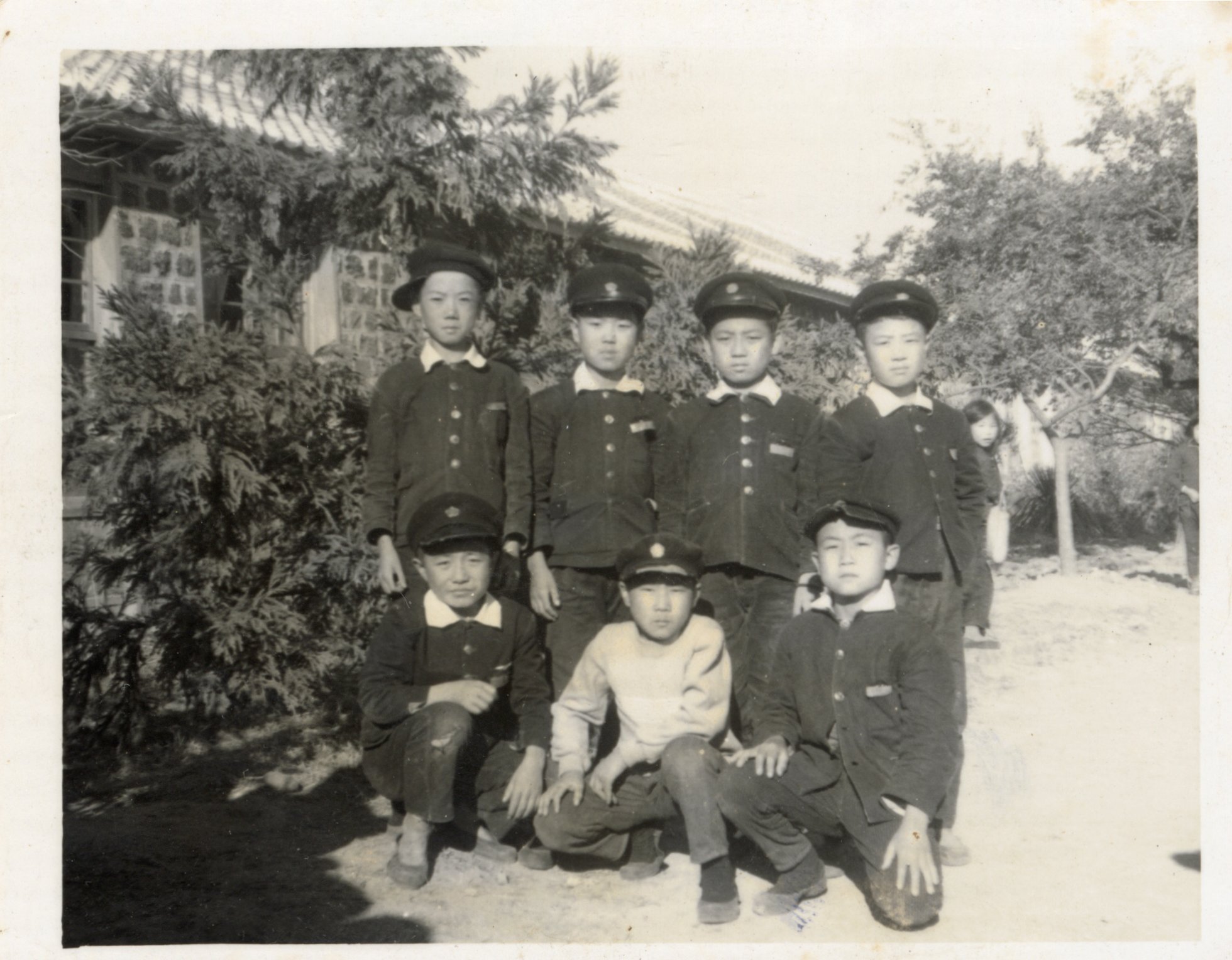 남학생 7명이 교정 내 나무들과 학교 건물 앞에서 서거나 쪼그려 앉아 포즈를 취하고 있다. 대부분 학생들은 일제식 교복을 입고 무궁화 문양 안에 ‘국(國)’ 자가 새겨진 모자를 쓰고 있다. 학생들의 왼쪽 가슴팍에 이름표가 달려 있다.