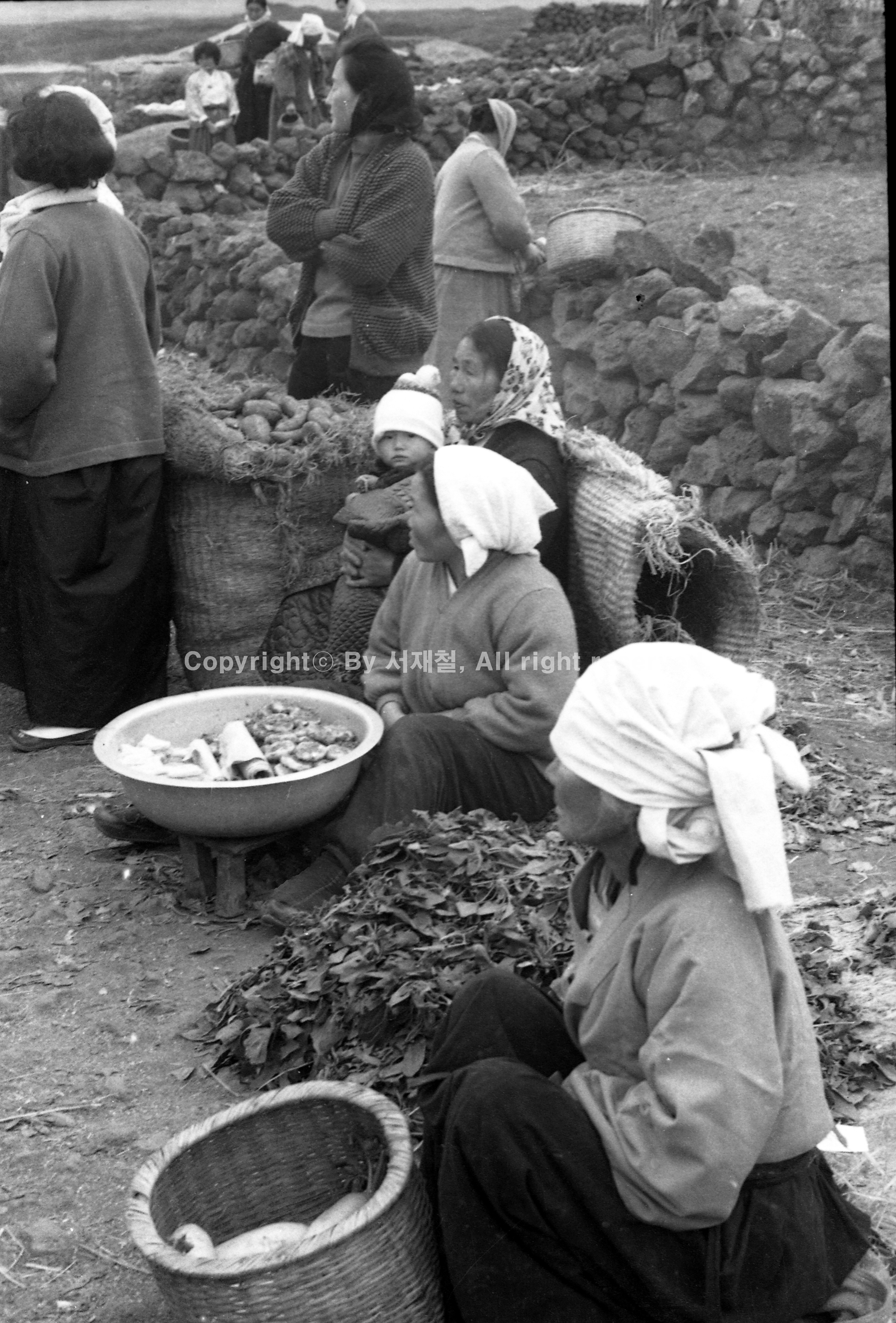 옛 오일장에 한 할머니가 바구니에 무를 가지고 와 팔고 있다.