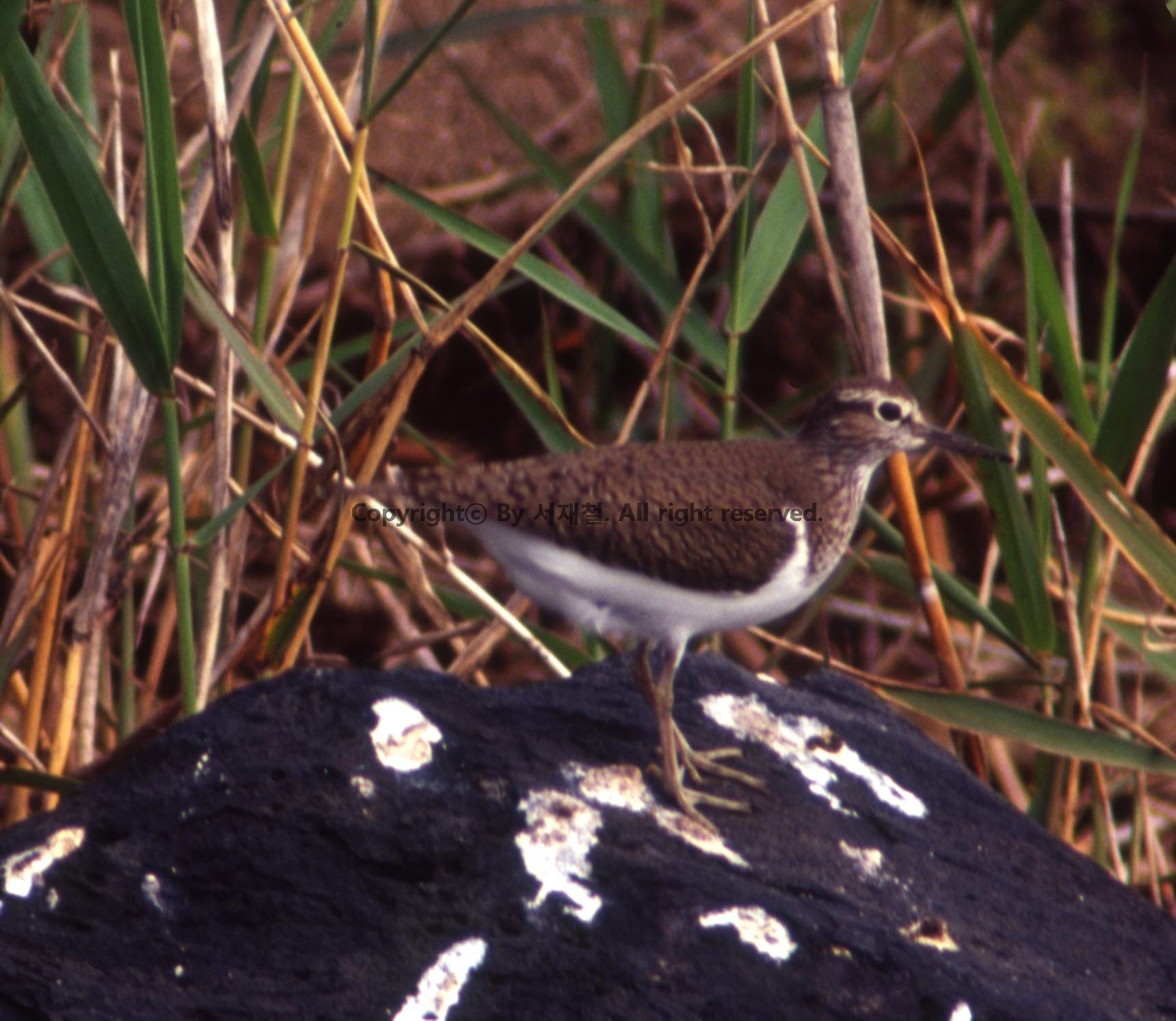 깝작도요가 먹이를 먹고 난 후 바위에서 쉬고 있다.