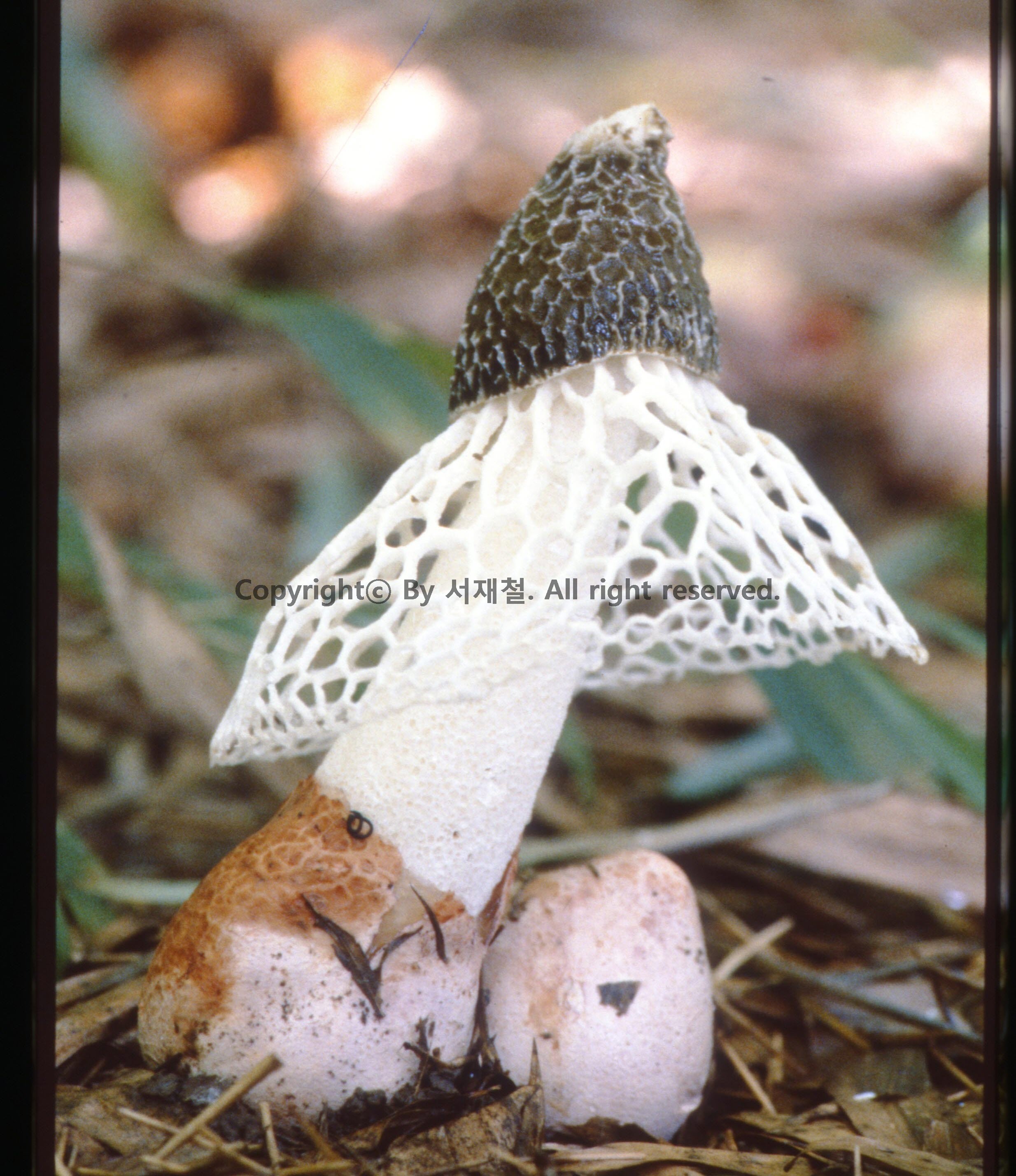 여름에서 가을 사이에 주로 대나무밭이나 잡목림 등의 땅 위에서 난다. 자루의 위끝 근처에 종 모양의 균모 내부에 흰 그물 모양의 레이스 비슷한 망토를 편다.